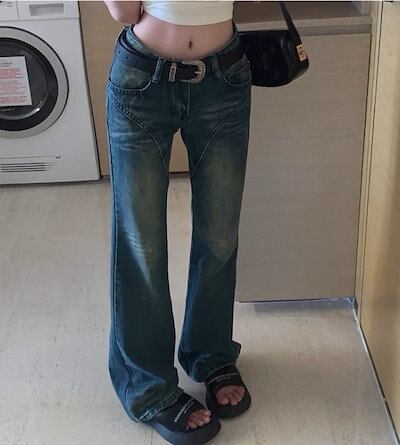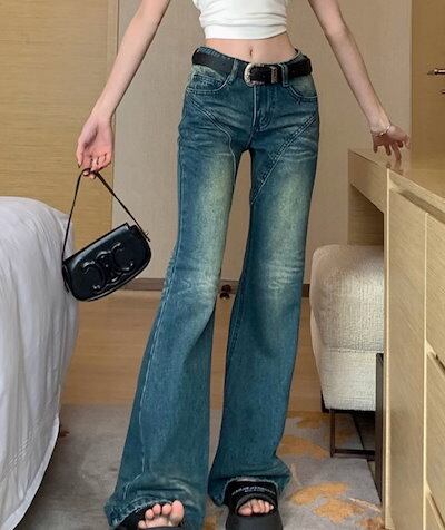 2024春夏 アメリカン パンツ デニム ブルー ジーンズ ロング丈 スキニー レッグ加工 ハイウエスト 脚長効果 美脚効果 細見え 秋 カジュアル 韓国ファッション お出かけ1