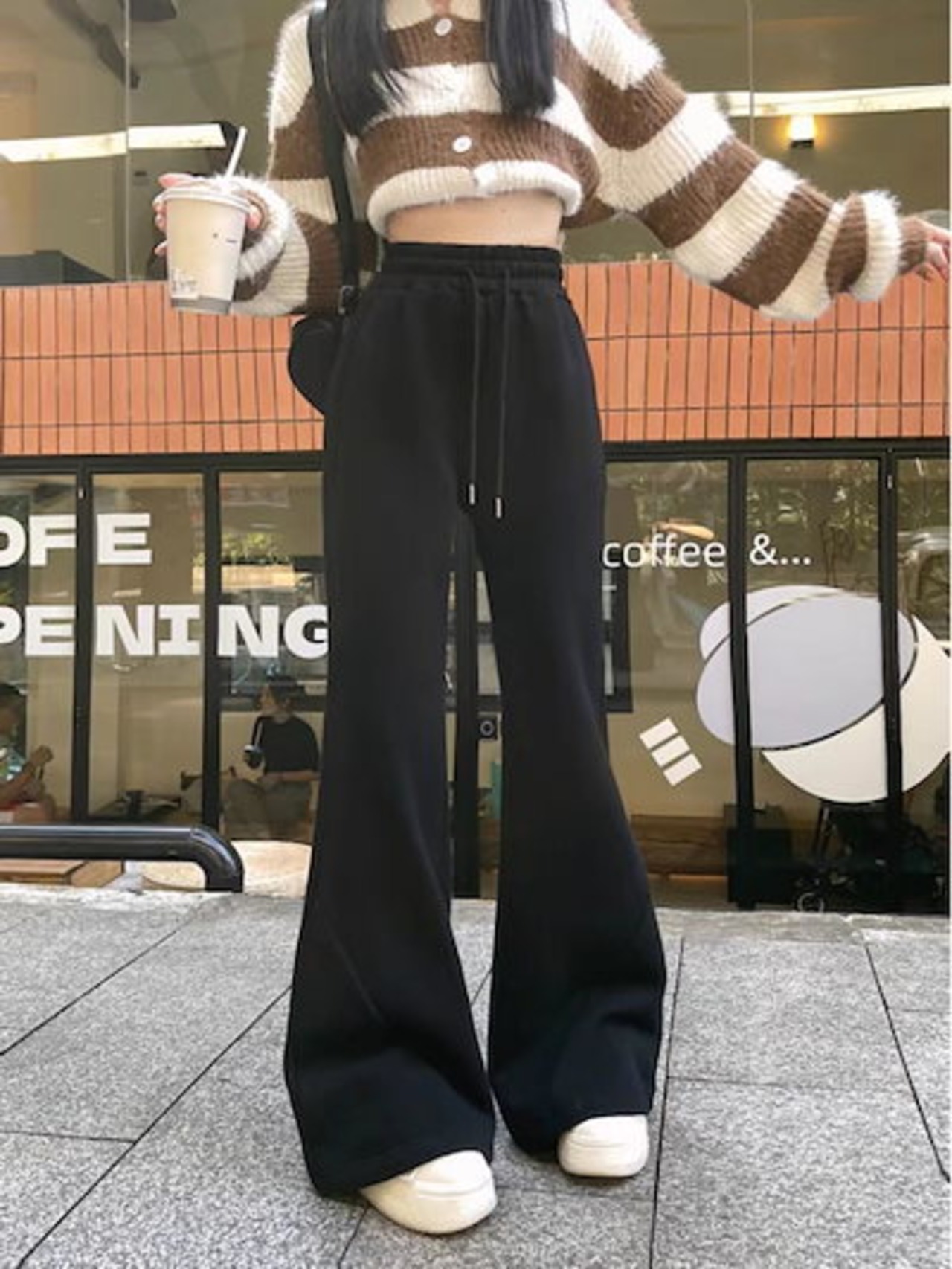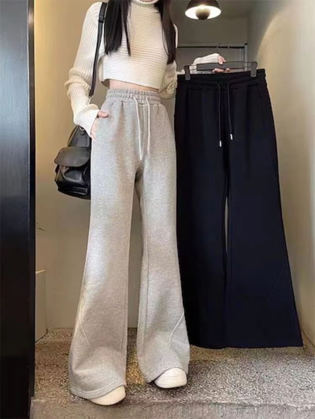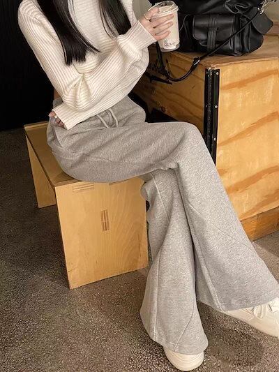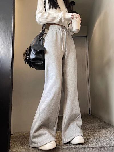 パンツ スウェット 厚手 ウエストゴム ロング丈 ワイドレッグ ハイウエスト 脚長効果 美脚効果 細見え 秋冬 シンプル カジュアル 韓国ファッション レディース お出かけ