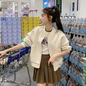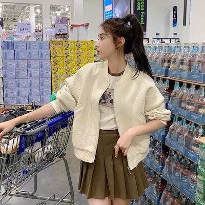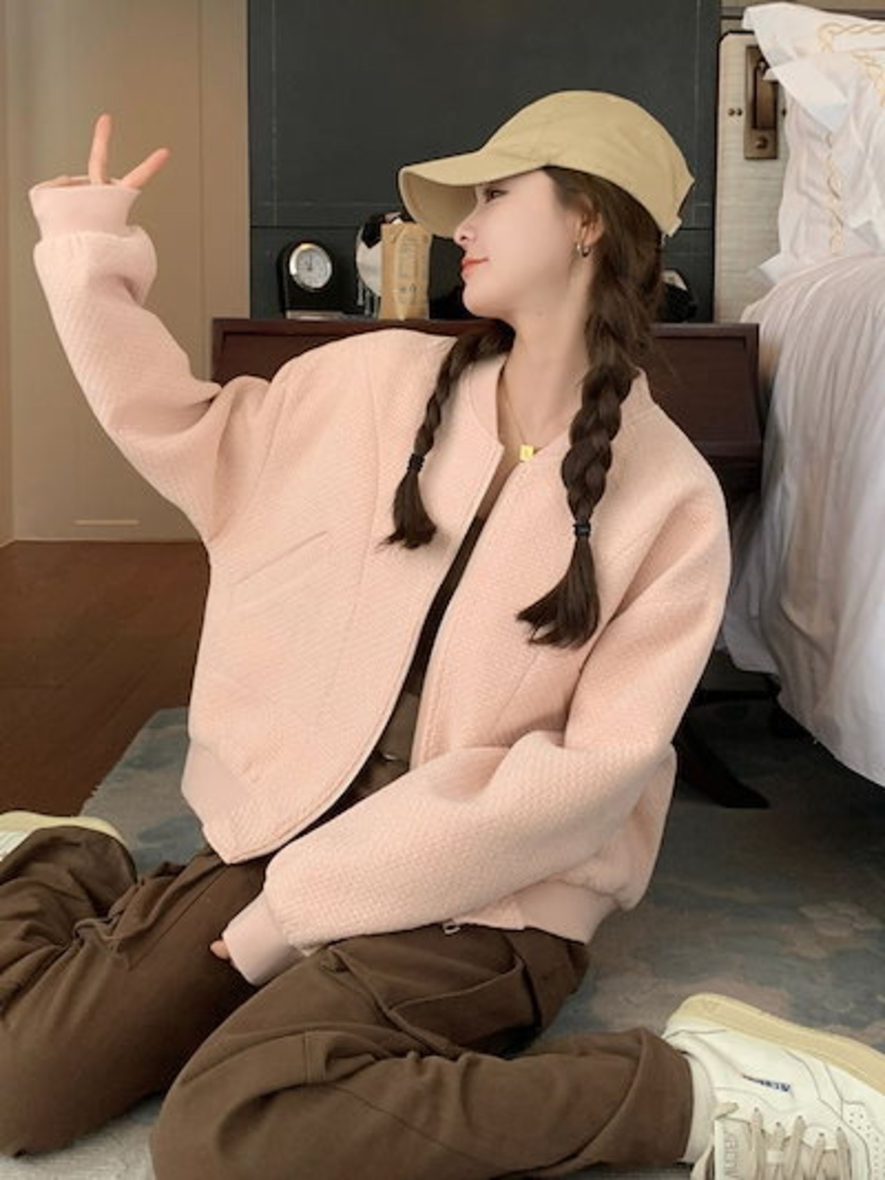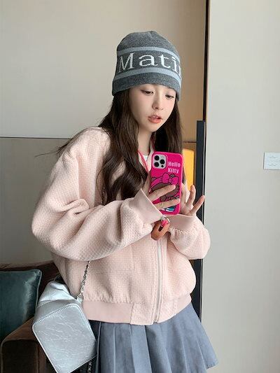アウター ピンク プレッシャープリーツ ベースボールジャケット レディース 2025春秋新作 カレッジスタイル スモール ショート 韓国ファッション