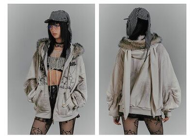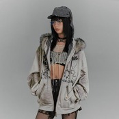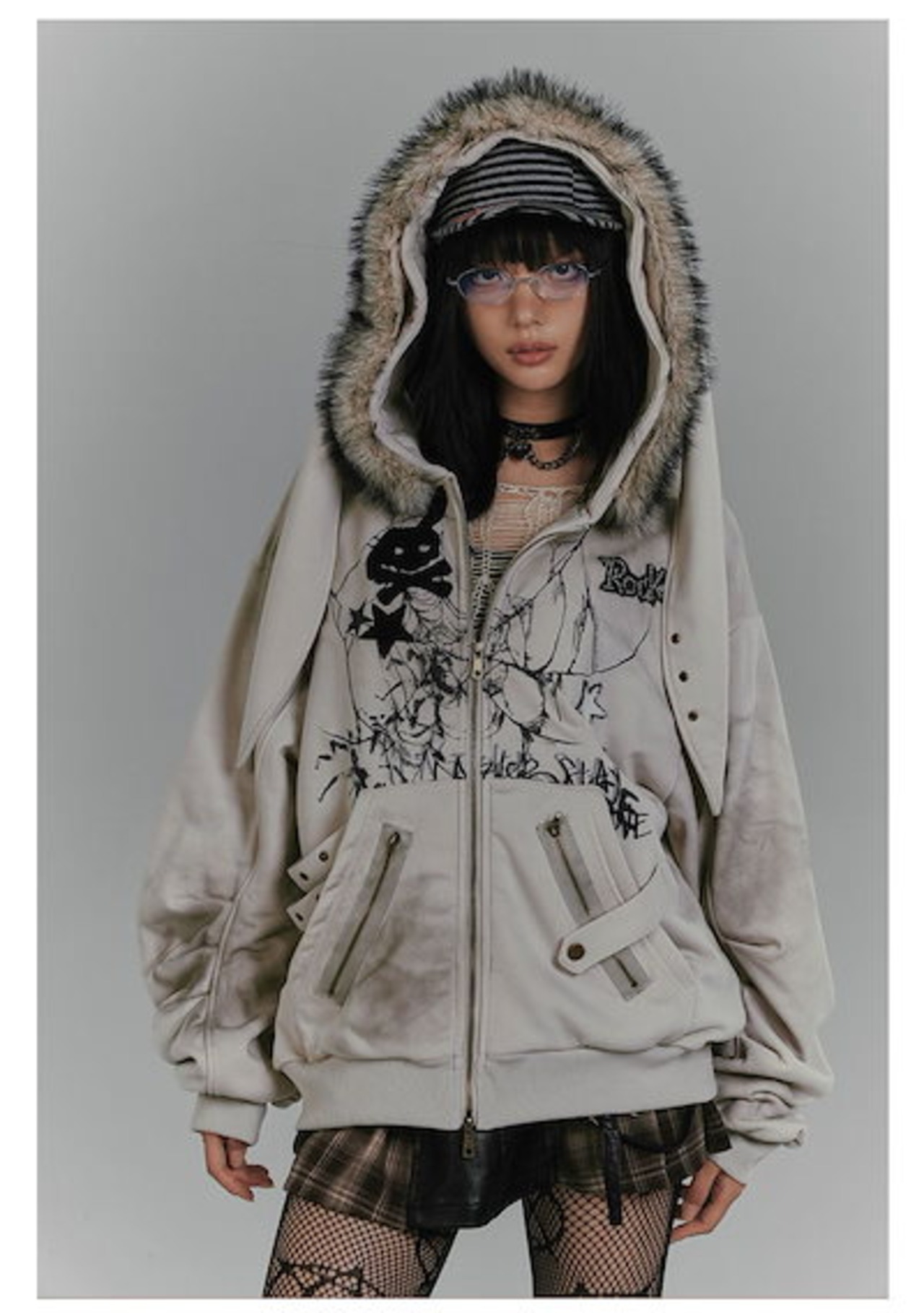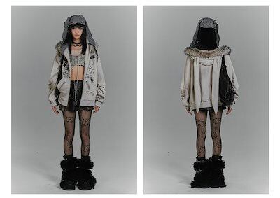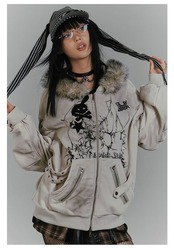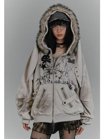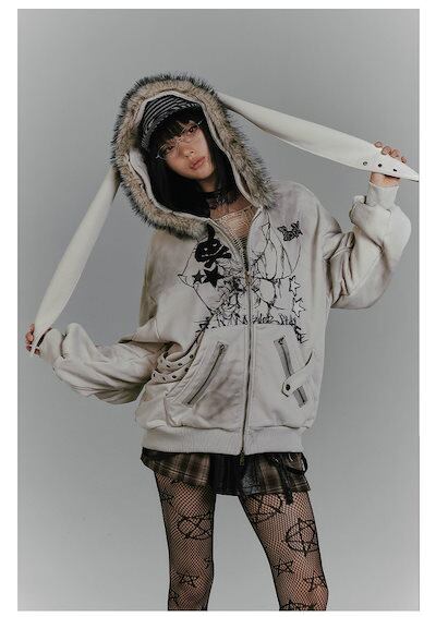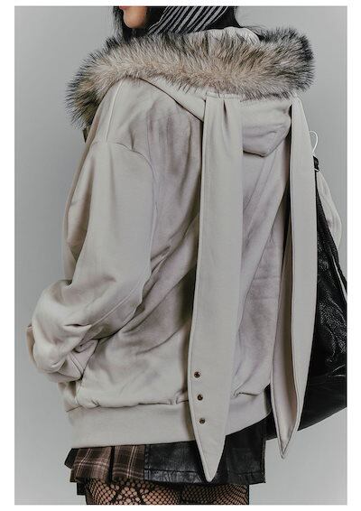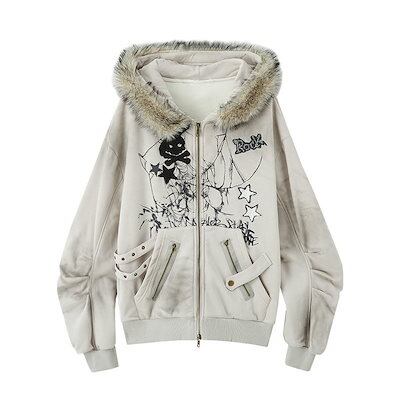 ジャケット 毛襟ウサギ耳フード付きスウェットジャケットプリント中わた入り厚手レディーストップス秋冬