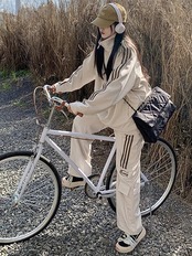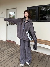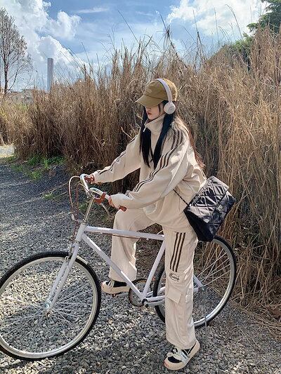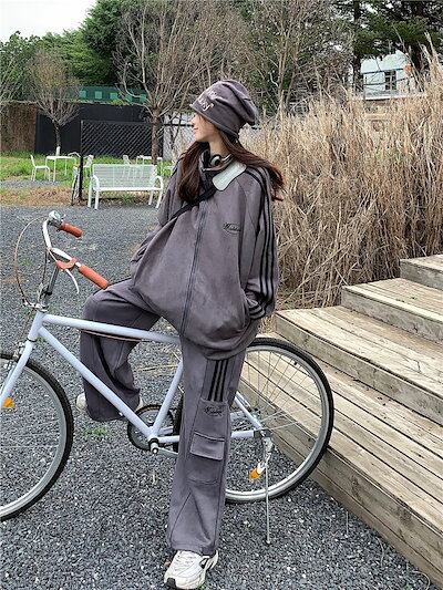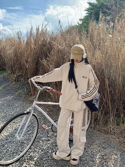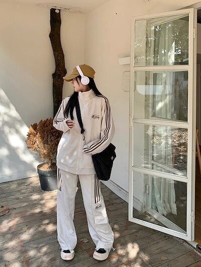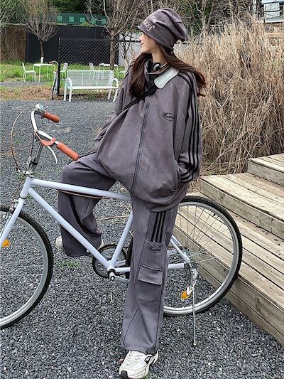 2024 秋冬 2点セット トップス ハイネック スタンドネック 羽織り ショート丈 フルパーカー ルーズ サイド上下ボトムス ストレート系冬 ゆったりサイズワイドシルエットリラックストラック