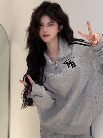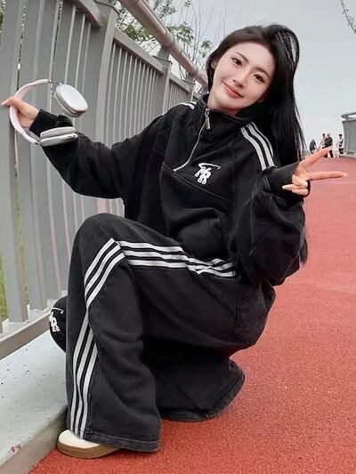 2024 秋冬 2点セット トップス 羽織り ショート丈 セットアップフルパーカートレーナーラウンドヘムルーズ サイド上下ボトムスストレート系冬ゆったりサイズワイドシルエットハーフリラックストラック