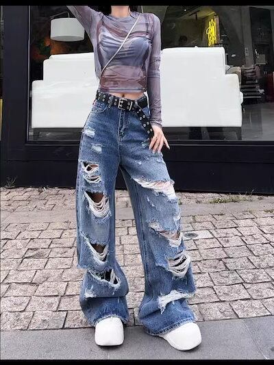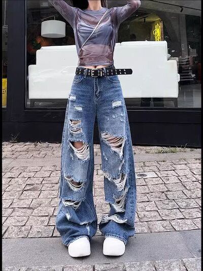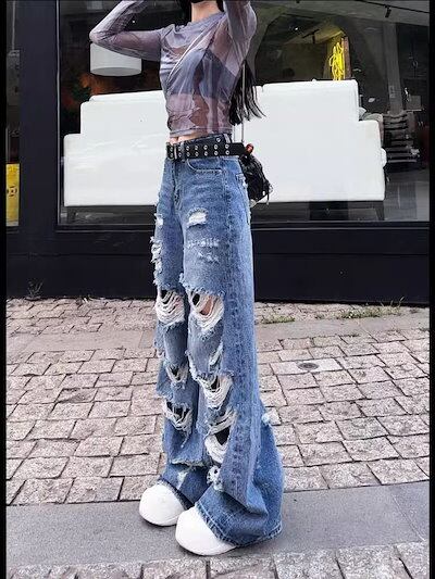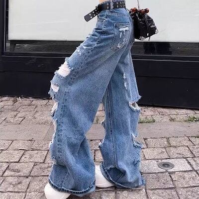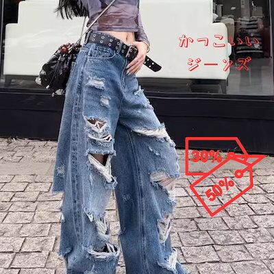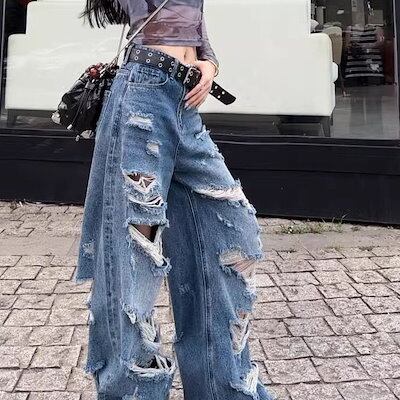 レディー 夏 ハイウエスト ゆったり ストレートパンツ ワイドパンツ レディース 大きいサイズ ダメージジーンズ