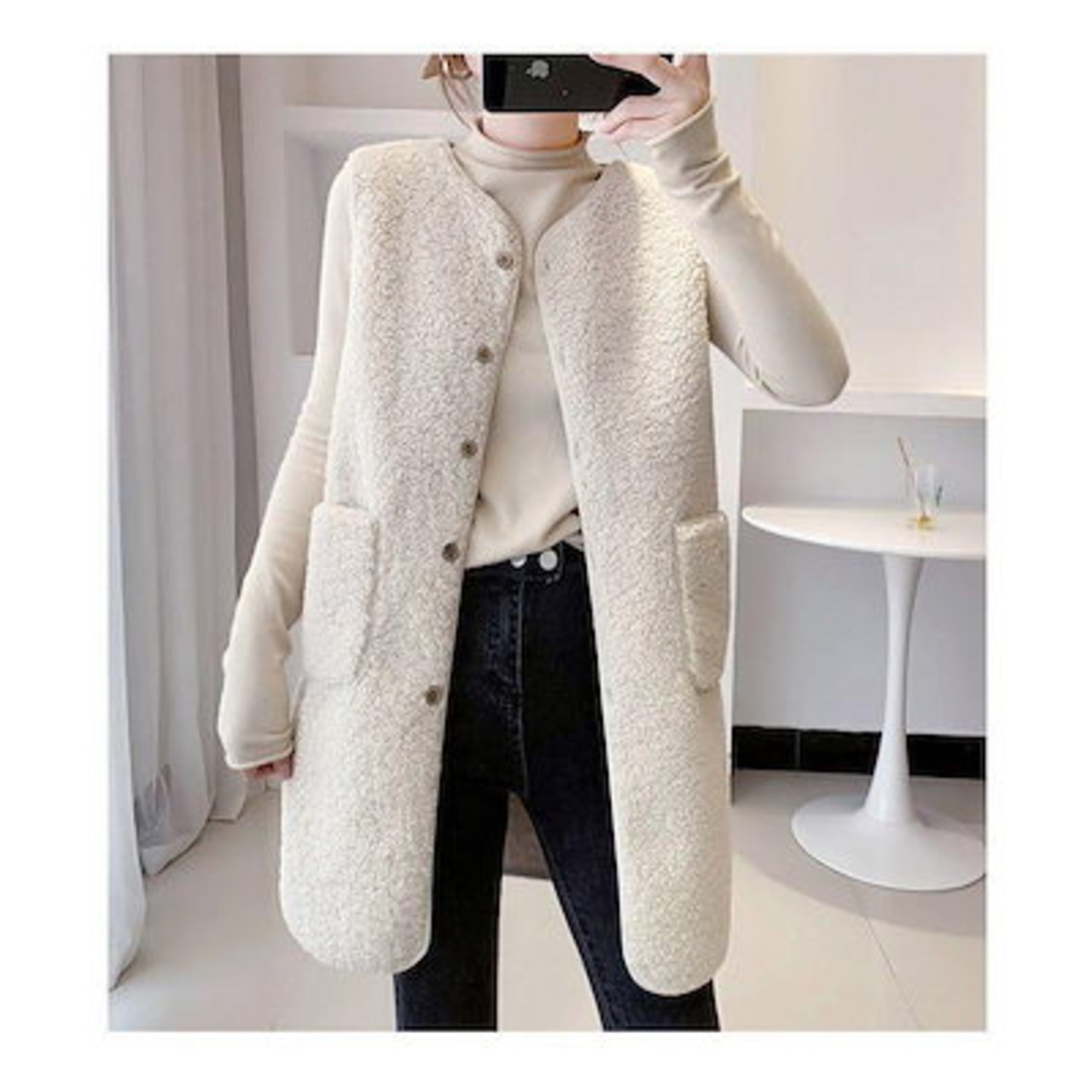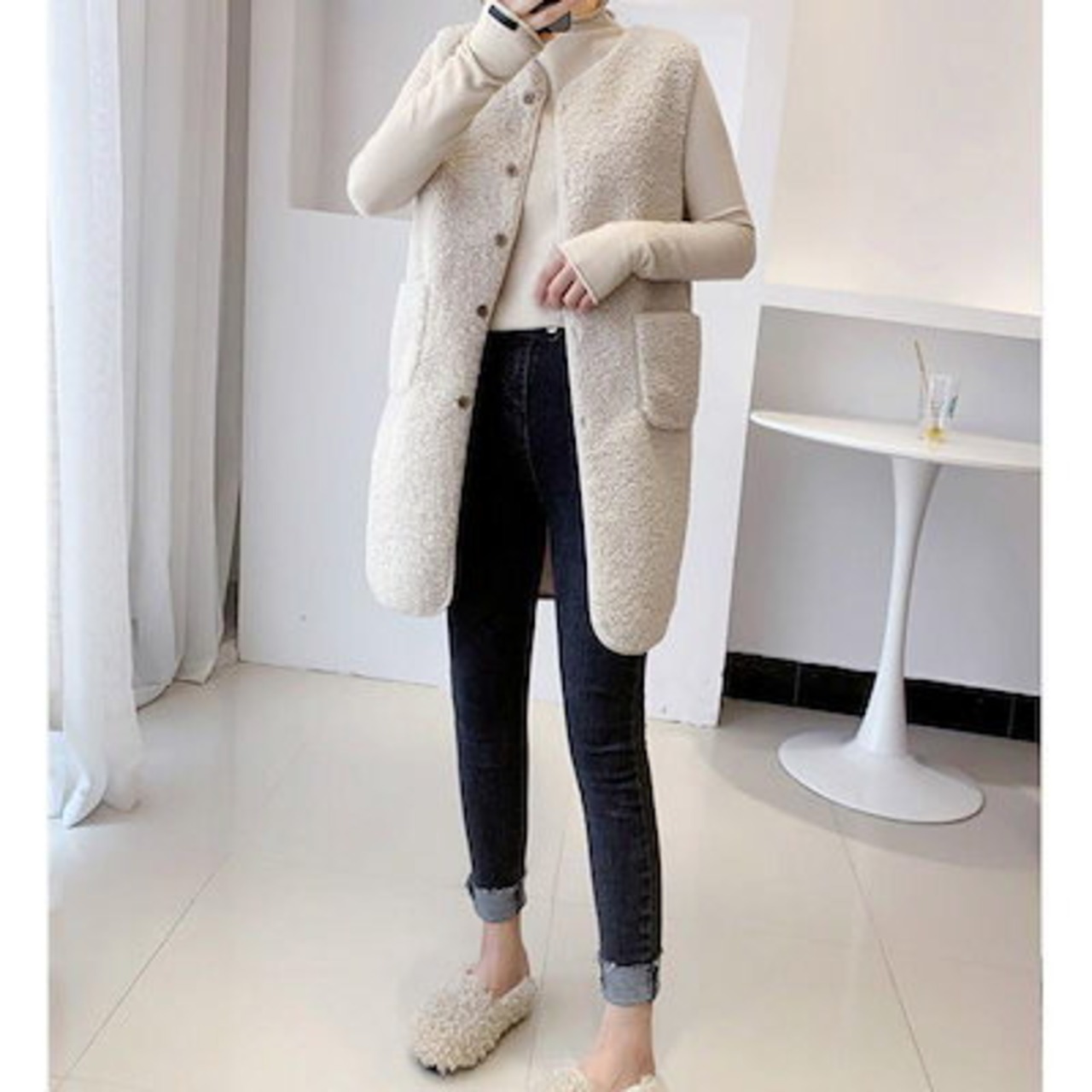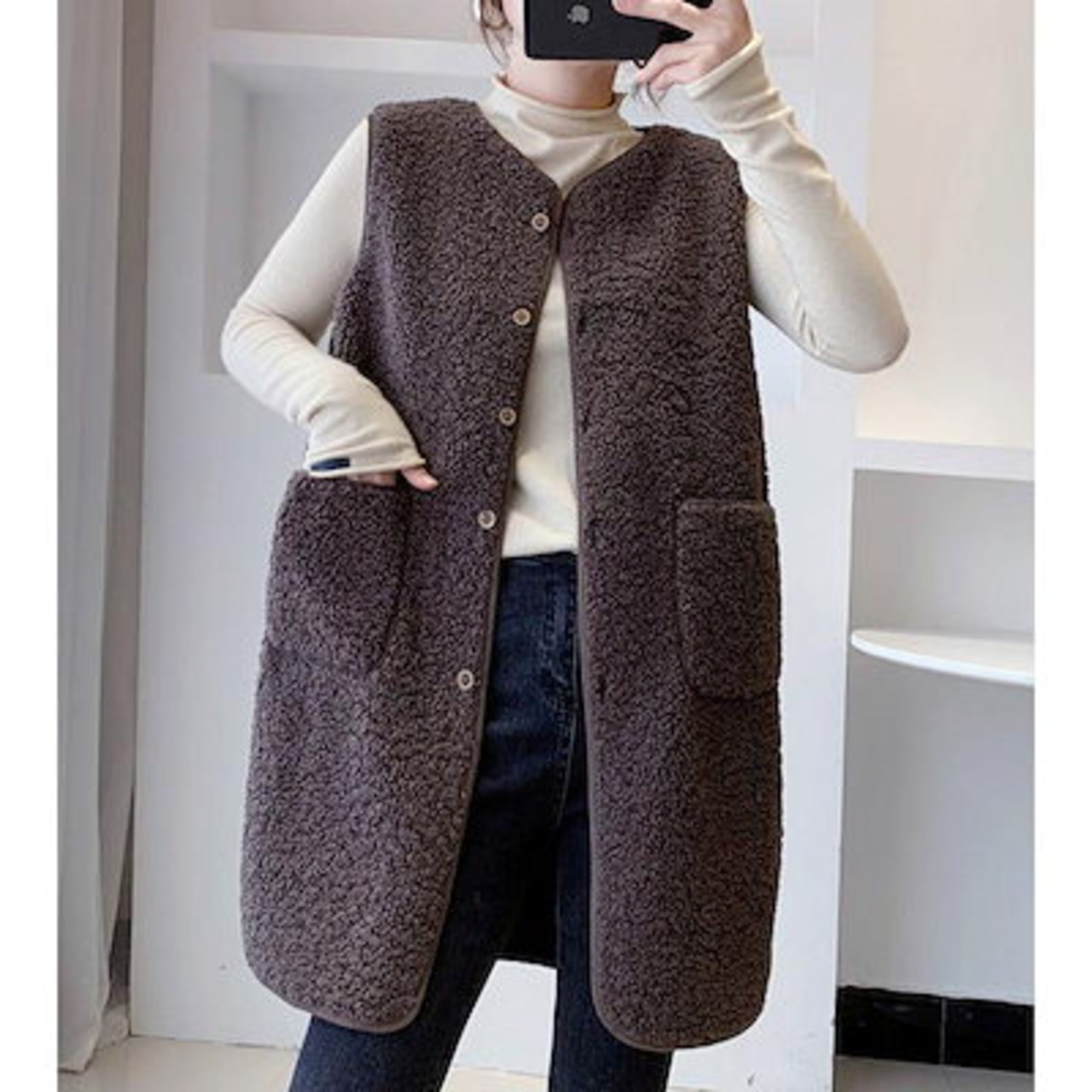 改良版加厚ボア レディース ジャケット アウター チョッキ ロング丈 フリース 前開き もこもこ 着痩せ 体型カバー