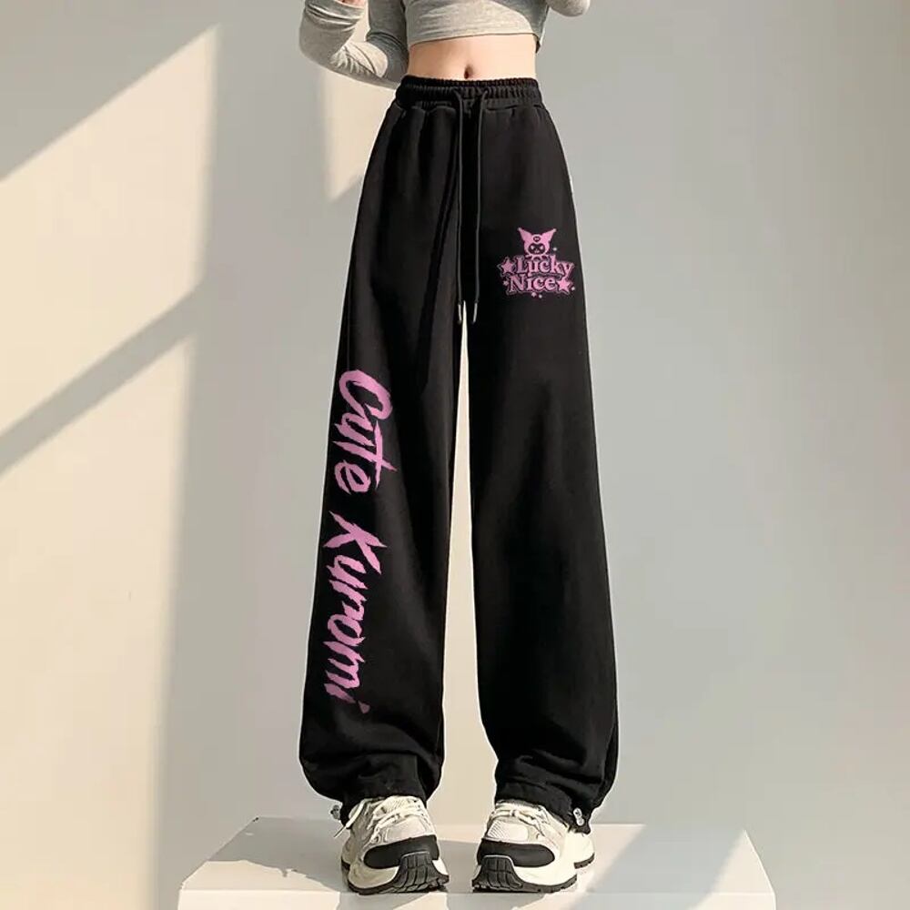 女性のためのsanrio kuromi漫画パンツ、ワイドレッグパンツ、ハイウエスト、ヒップホップストリートウェア、カジュアルスポーツパンツ、y2k y2k ボトムス T240901105100_01