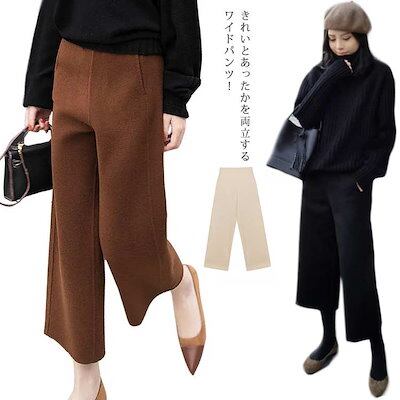 メガ割 ワイドパンツ レディース ウール調 ガウチョパンツ 9分丈 ロングパンツ 長ズボン リラックスパンツ ウエストゴム 無地 大きいサイズ ボトムス ウールライク 暖かい あったか ゆったり 体型