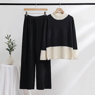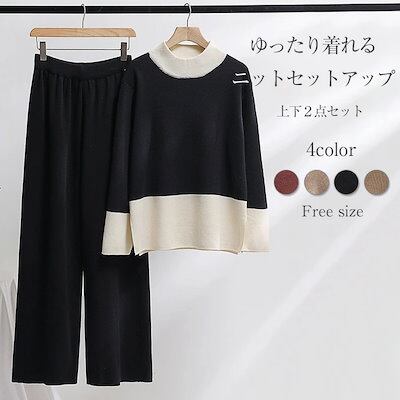 ニットセットアップ 2点セット パンツ レディース 秋 冬 長袖 ニットパンツ ワイドパンツ クルーネック セータートップス 上下セット 大人カジュアル シンプル ゆったり可愛い おしゃれ 着痩せ き