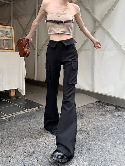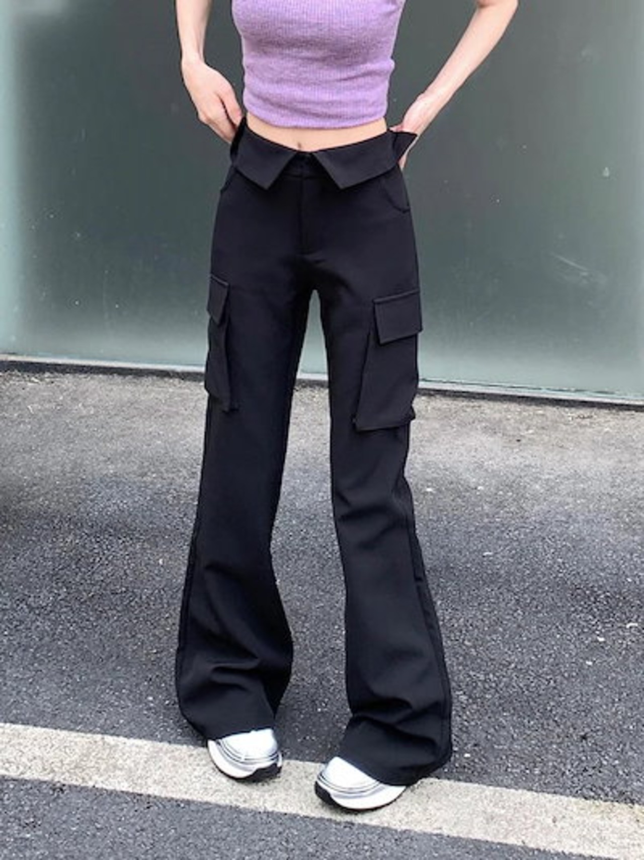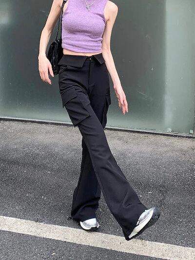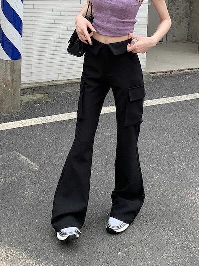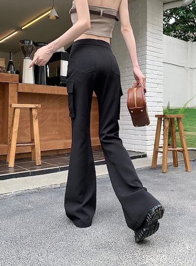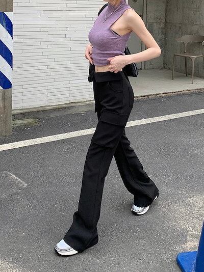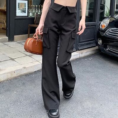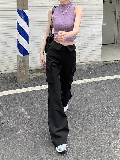 24パンツ ワイド ストレート ハイウエスト 脚長効果 美脚効果 細見え ポケット 黒 カジュアル おしゃれ かわいい 韓国ファッション レディース お出かけ
