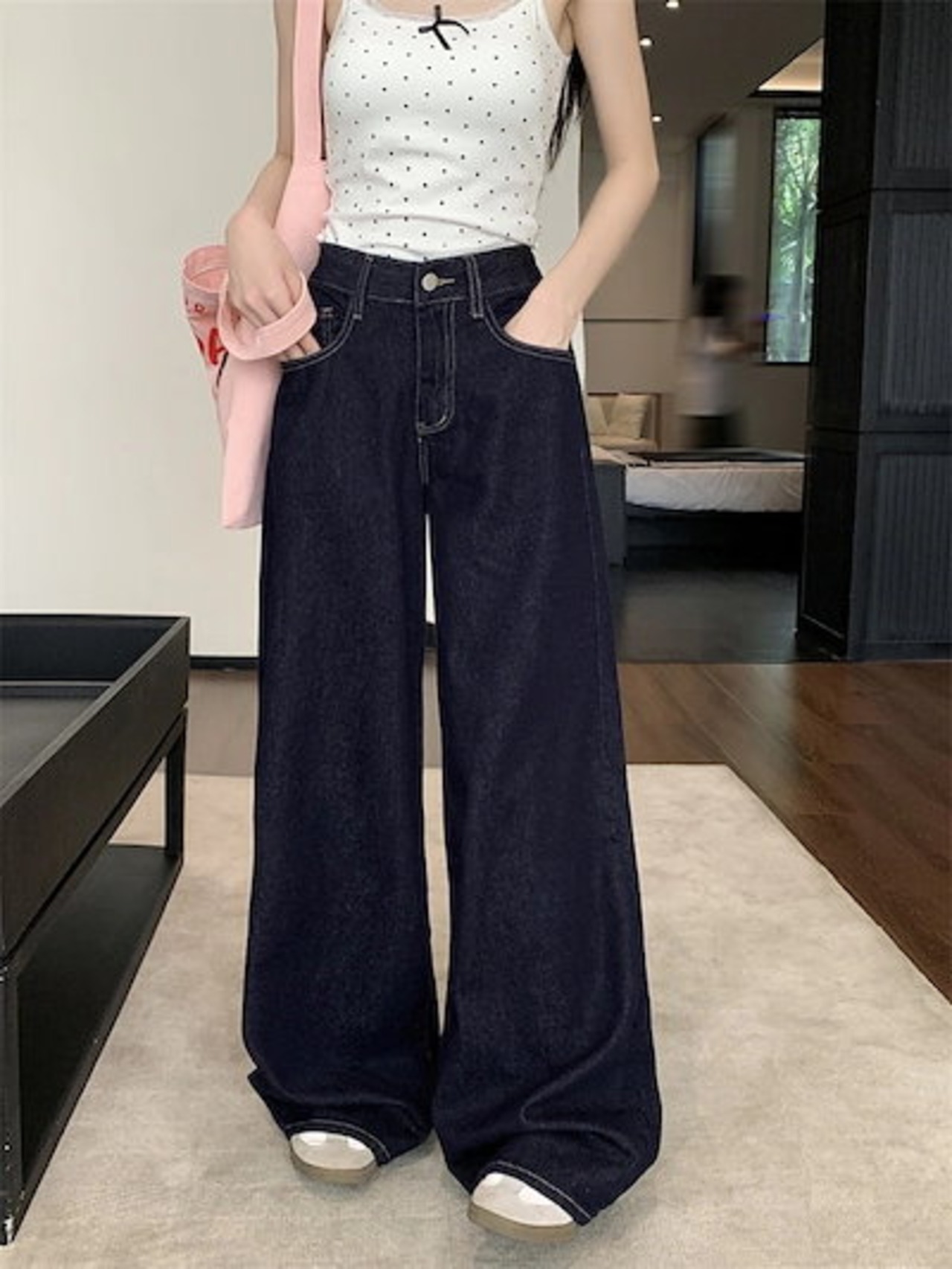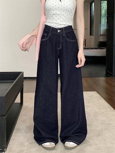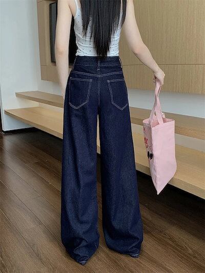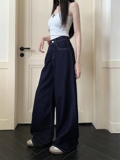 24パンツ ロング丈 デニム ジーンズ ワイド ストレート ハイウエスト 美脚効果 脚長効果 細見え レトロ インディゴブルー 韓国ファッション レディース かわいい おしゃれ カジュアル