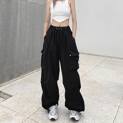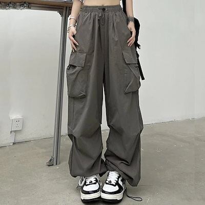 メガ割 新作カーゴパンツレディースゆったりワイドルーズズボンボトムスおしゃれかわいい黒メンズライク