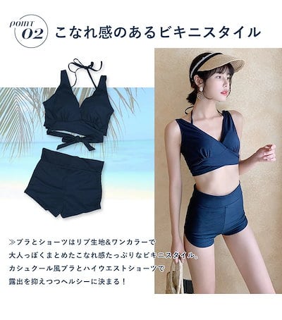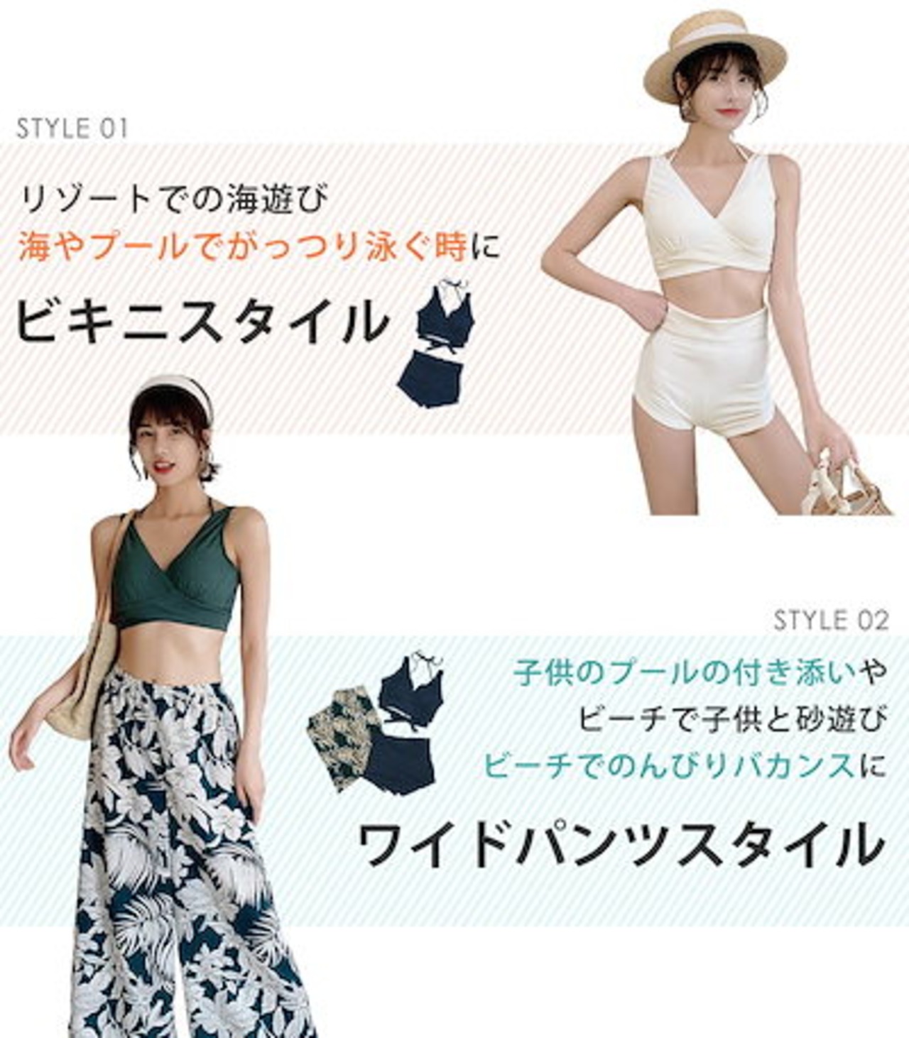 人気 水着 レディース 体型カバー 水着 タンキニ Vネック ビキニ ワイドパンツ 3点セット 代 30代 40代 ママ水着 ロングパンツ バックシャン カシュクール風 可愛い お洒落 くすみ