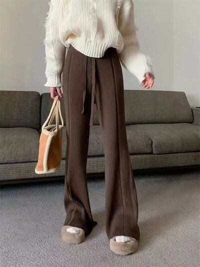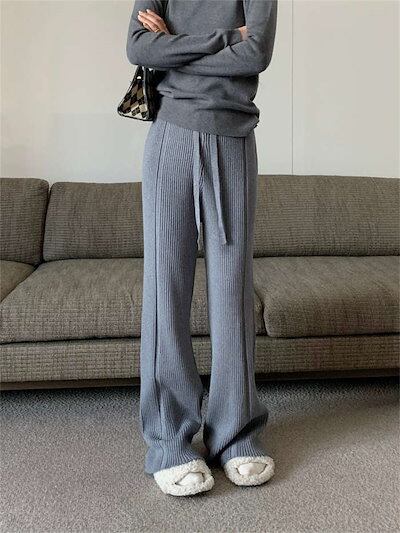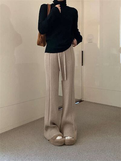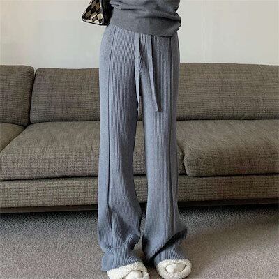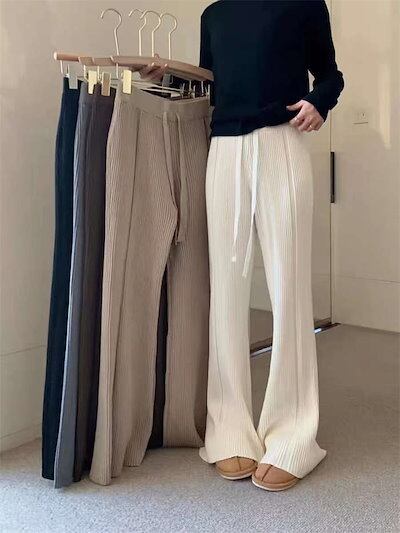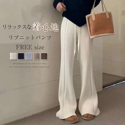 ニットパンツ レディース 秋 冬 リブパンツ ワイドパンツ リブ リブニットパンツ ウエストゴム ストレートパンツ プリーツパンツ リブニット パンツ 可愛い ゆったり リラックスパンツ ボトムス 無