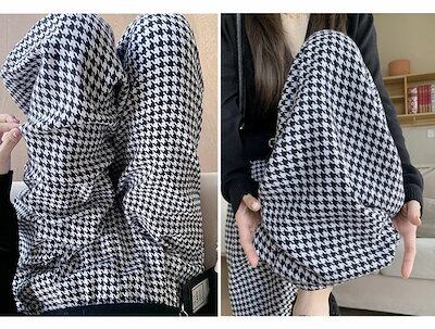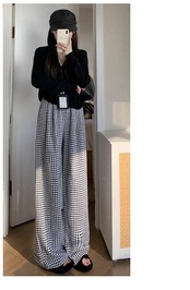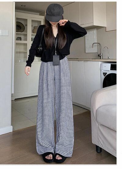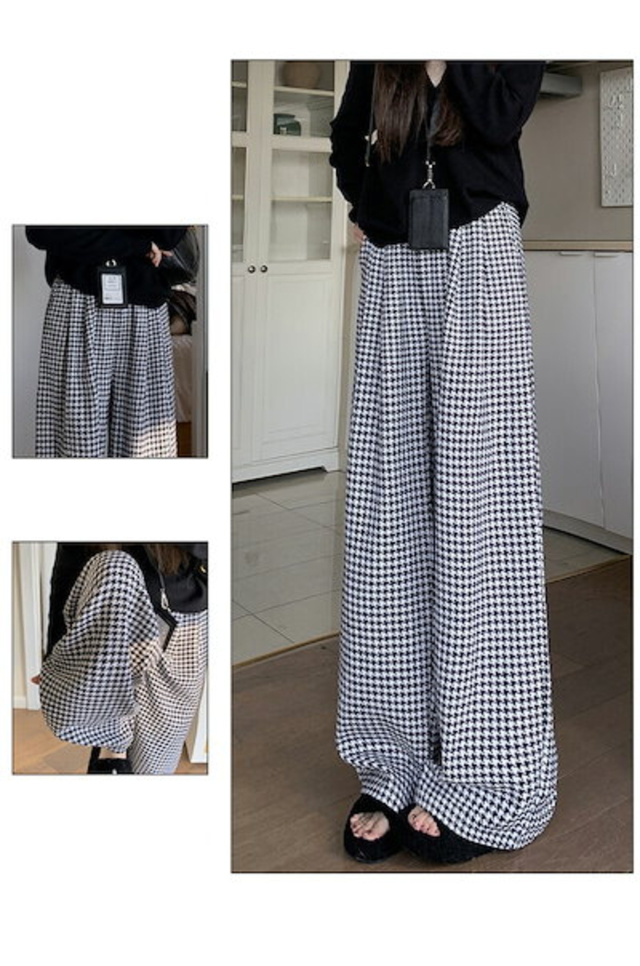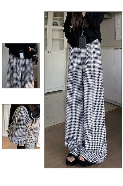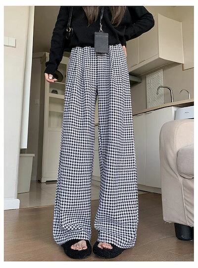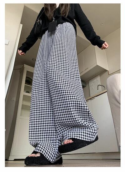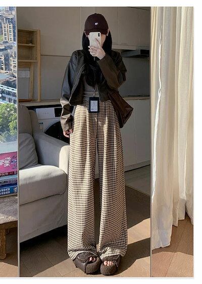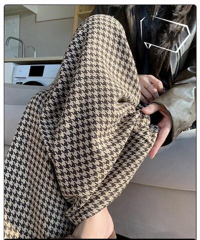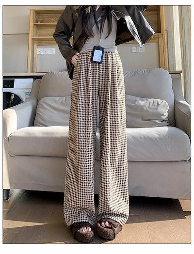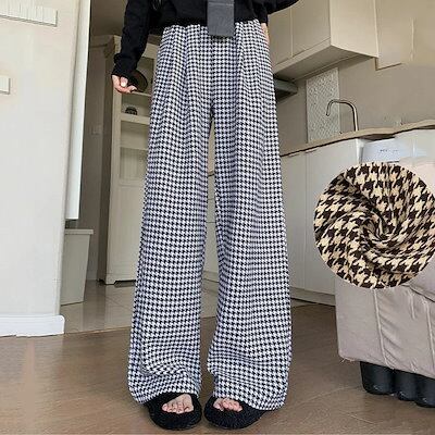ワイドパンツ レディース ストレートパンツ 千鳥格子 ロングパンツ チェック ボトム フロントタック イージーパンツ 秋冬パンツ ワイド 脚長 美脚 ボトムス ズボン 秋 冬 ウエストゴム ベージュ
