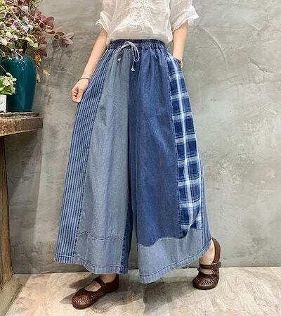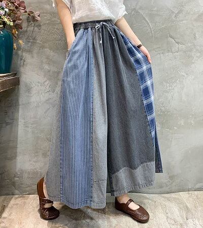 デニムワイドパンツ レディース デニムパンツ ワイドパンツ 切り替え 配色 ロングパンツ ウエストゴム ボトムス カジュアル 大きいサイズ 大人 楽ちん 美脚 ゆったり デニム 幅広い エレガント 体