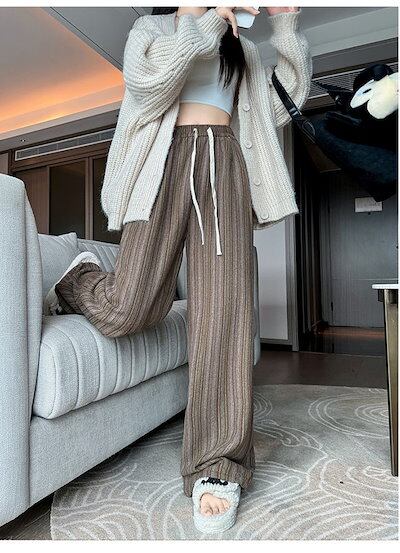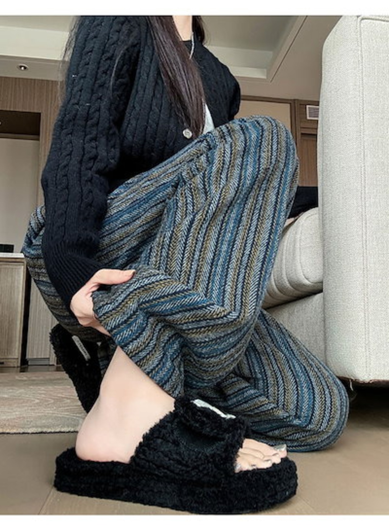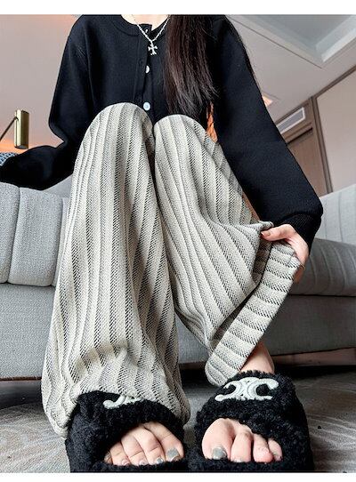 ワイドパンツ 春秋 ストライプ ストレートパンツ レディース ツイード調 イージーパンツ ストライプパンツ ロングパンツ 配色 ボトムス ウエストゴム カジュアル 大人 かわいい おしゃれ シンプル