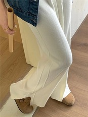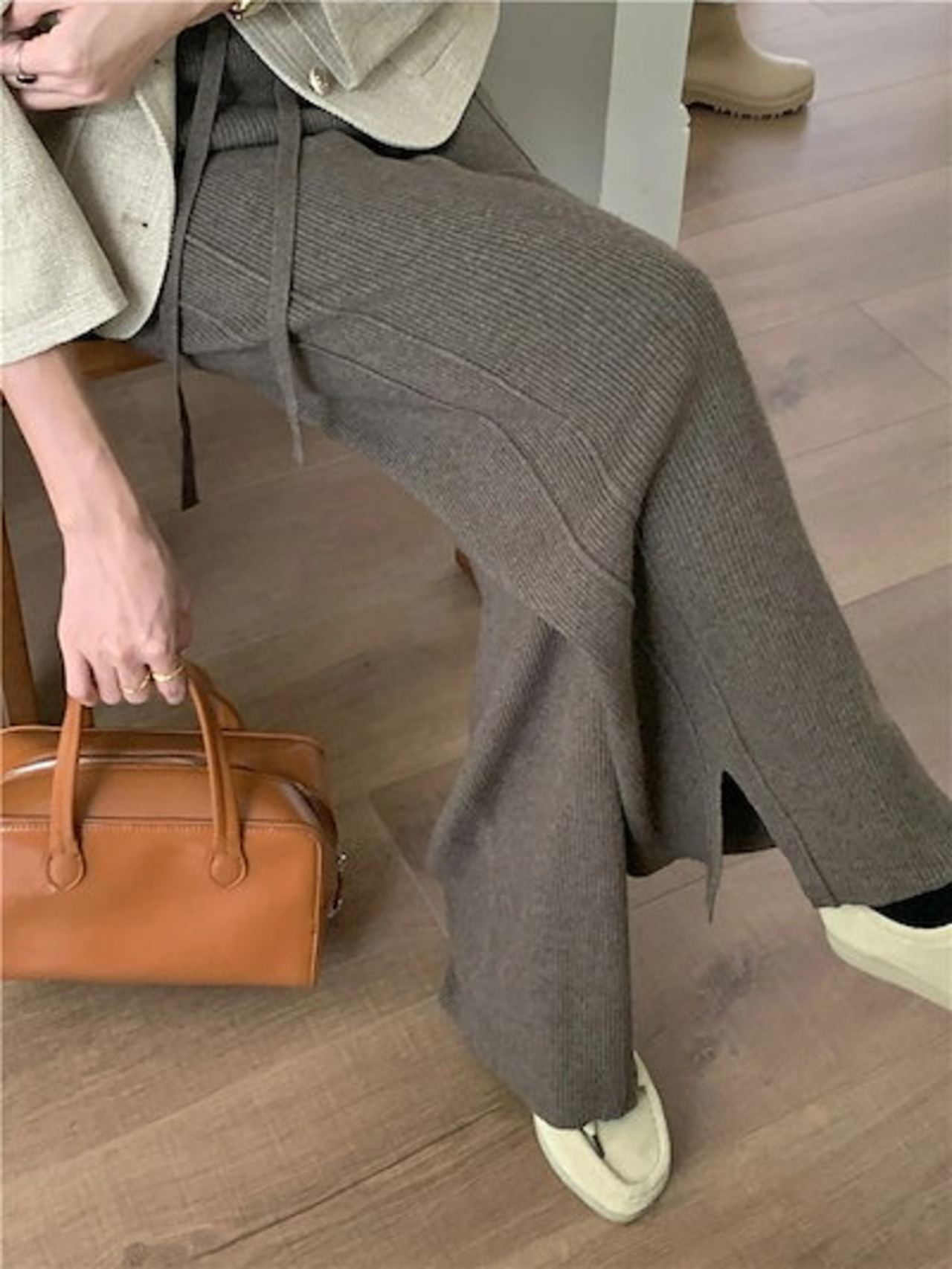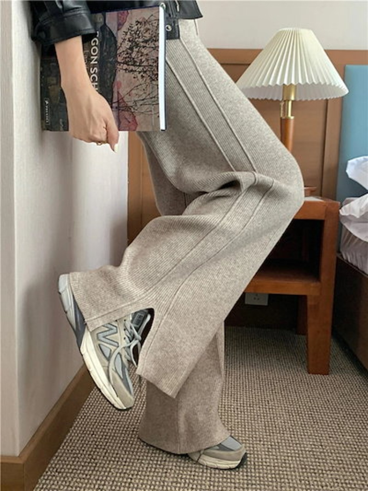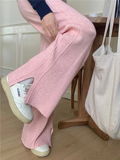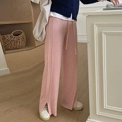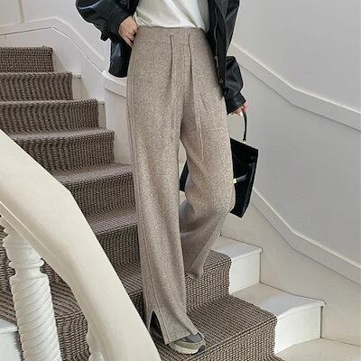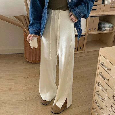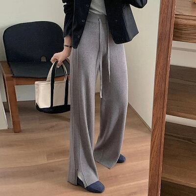 ワイドパンツ レディース 秋冬サイドスリット きれいめ ボトムス ロング丈 柔らか ウエストゴム ゆったり 通勤 イージー ニットセーター フリーサイズ 美脚 体型カバー 大人 カジュアル オフィス