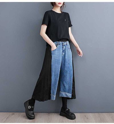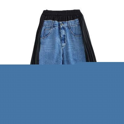 「ファットガール」 秋 九分丈 デニムパンツ ドッキング レトロ プリーツ ワイドパンツ ハイウエスト スラックス レディース ロングパンツ メガ割