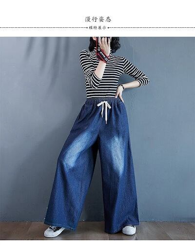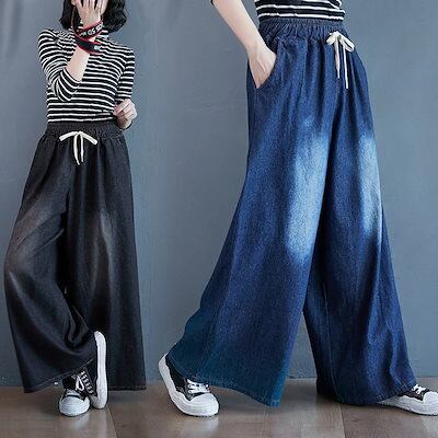 「ファットガール」 秋冬 デニムパンツ ゴム ワイドパンツ ハイウエスト 大きいサイズ ゆったり フレア レディース ロングパンツ