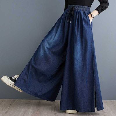 「ファットガール」 2024秋冬新品 ワイドパンツ ハイウエスト ゴム フレア スリット 大きいサイズ 体型ーカバー レディース ブーツカット ロングパンツ メガ割
