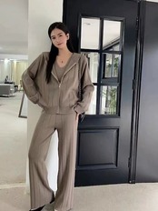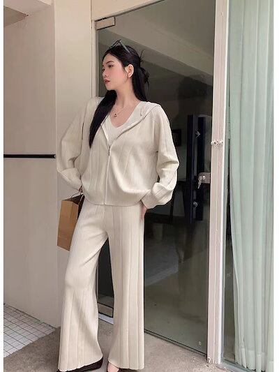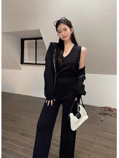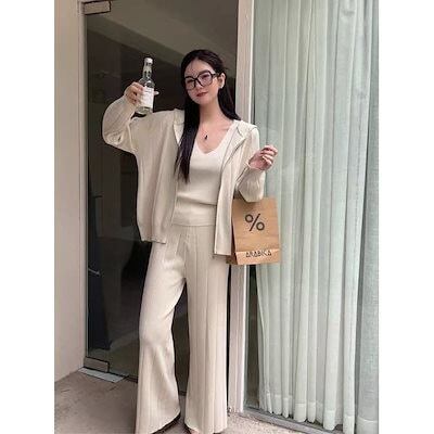 2025新作【高.品.質】 ニット セットアップ レディース 三点セット アウター 上下セット ロングパンツ 韓国ファッション トップス パンツ 高級感 ワイドパンツ 体型カバー 着痩せ