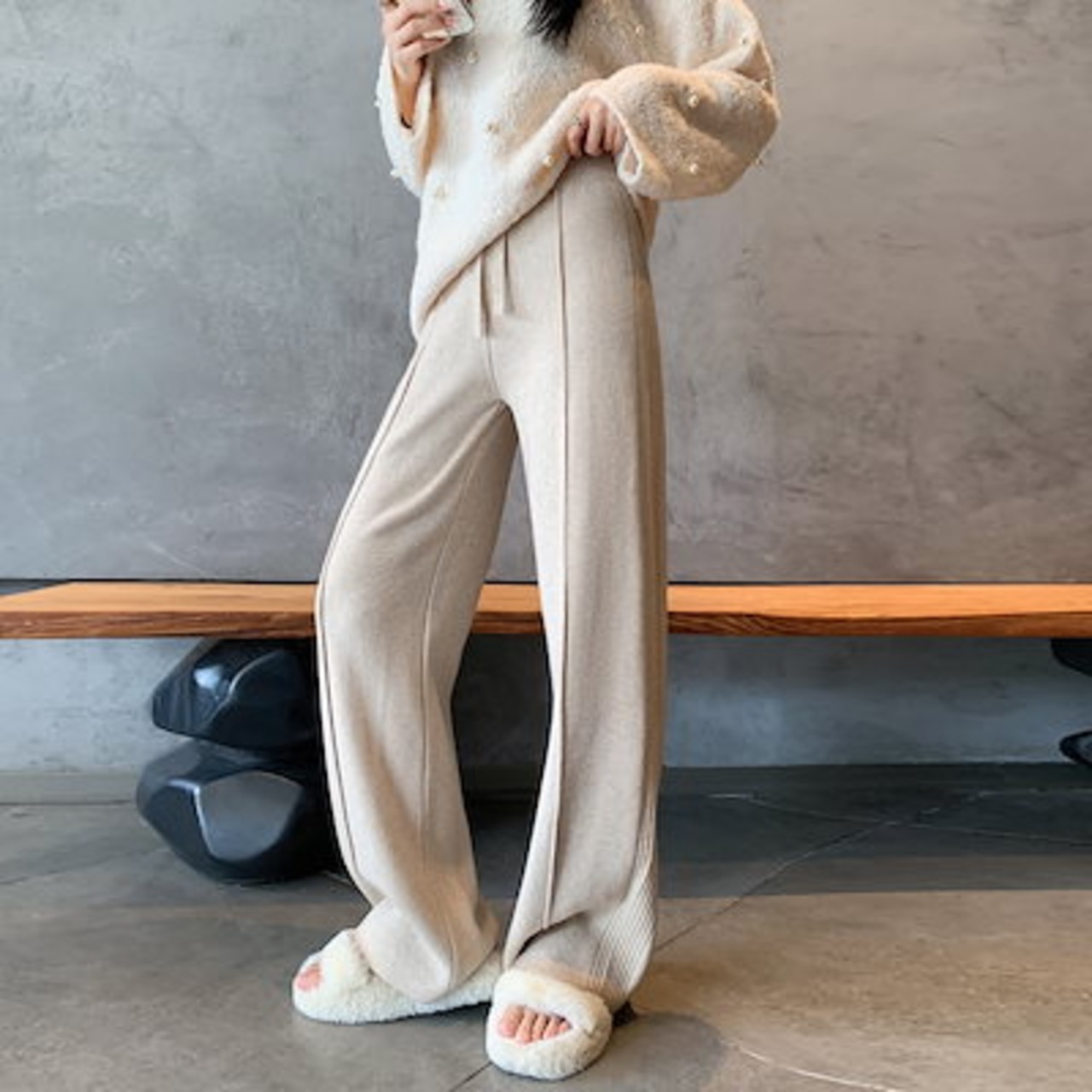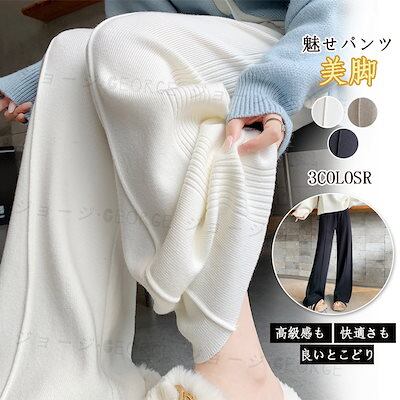 韓国ファッション 新作 ニットワイドパンツ ロングパンツ レディース 暖かい パンツ 体型カバー 着痩せ ゆったり