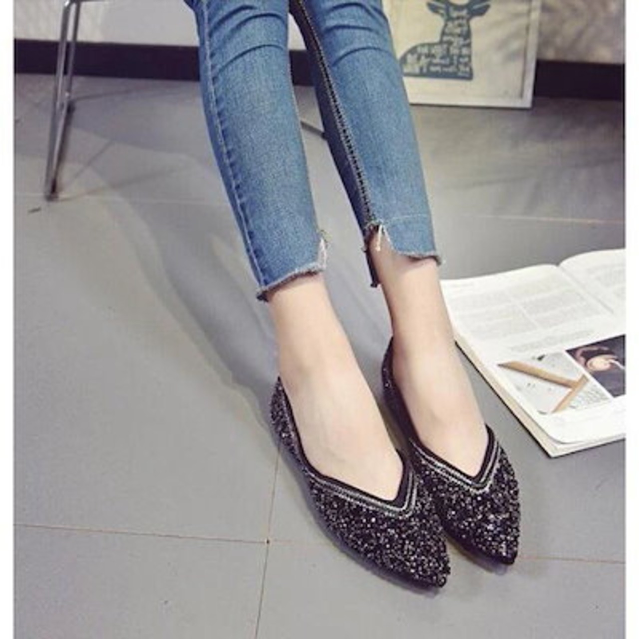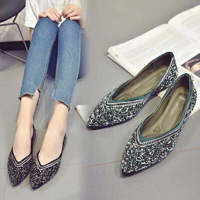 2色レディース 歩きやすいローヒール シューズぺたんこパンプスポインテッドトゥ靴キラキラフラットVカットカジュアル