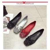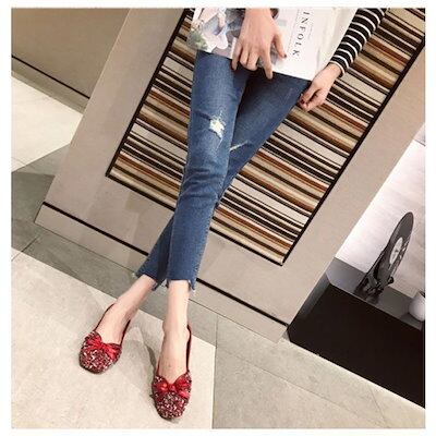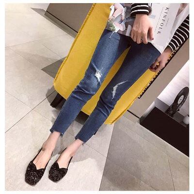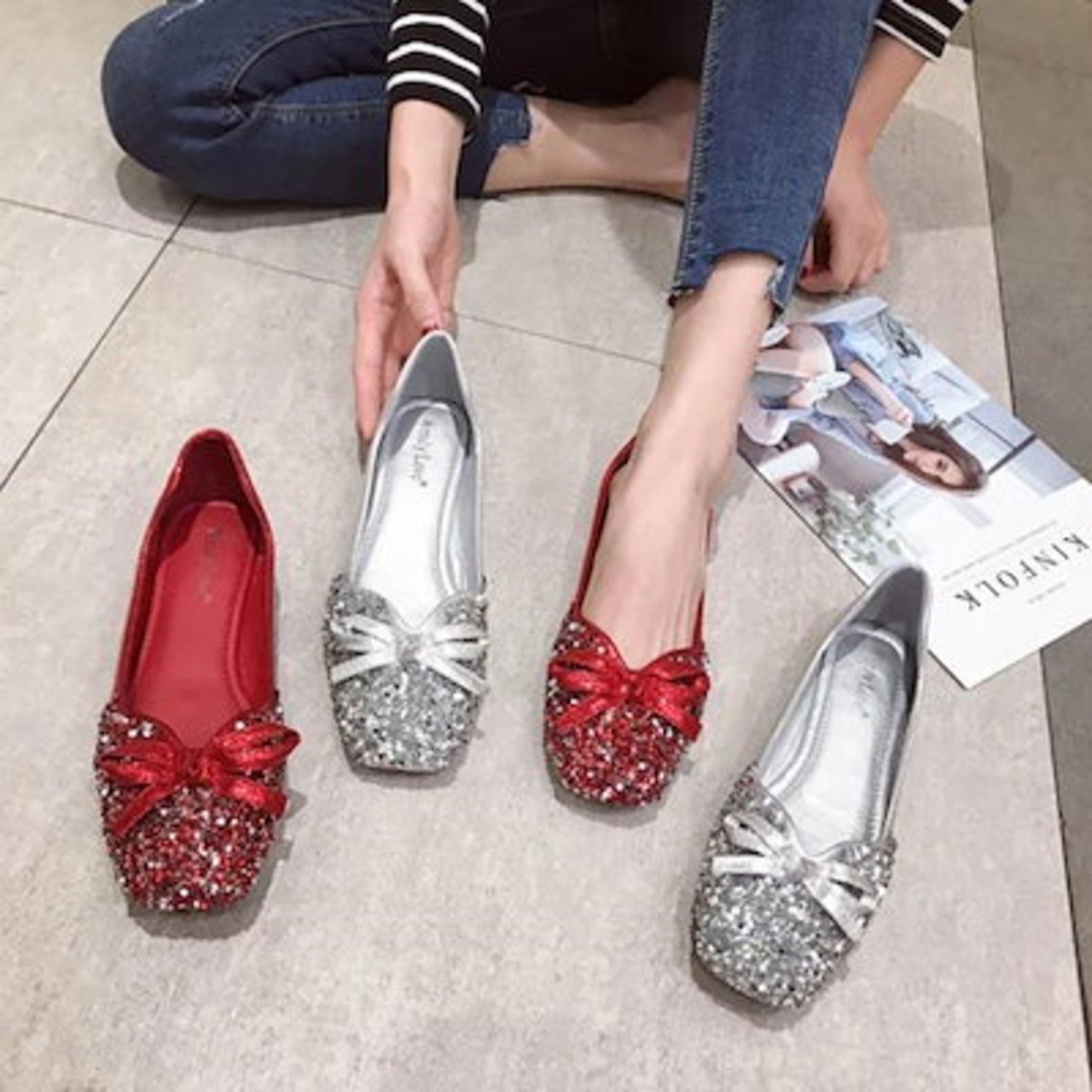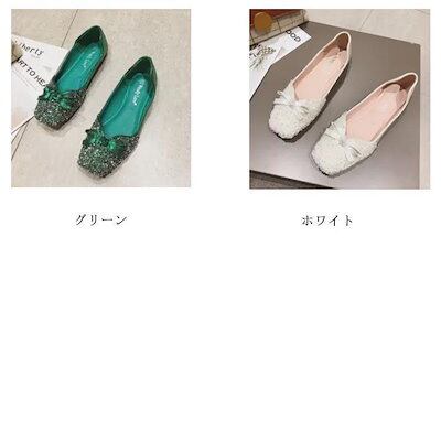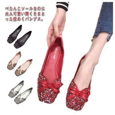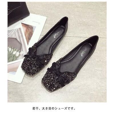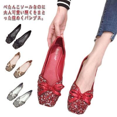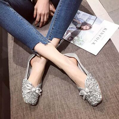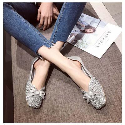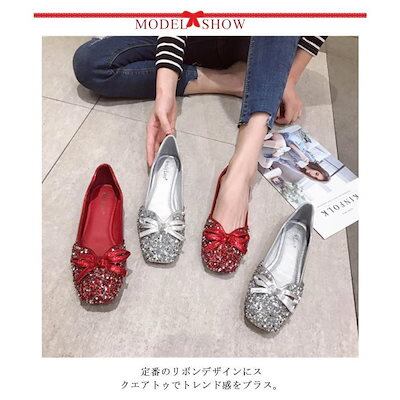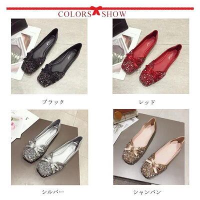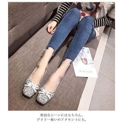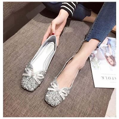 2025年新品の発売スクエアトゥ パンプス キラキラ ぺたんこ 痛くない Vカット ローヒール 結婚式 グリッター 走れる バレエシューズ フラット カラバリ オフィス
