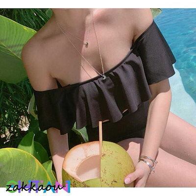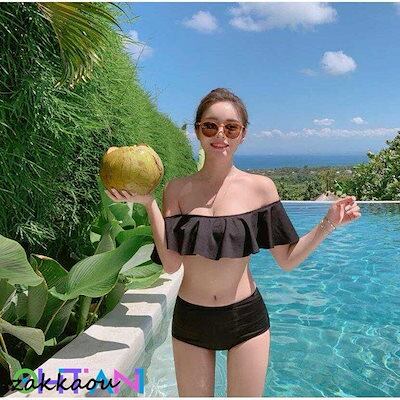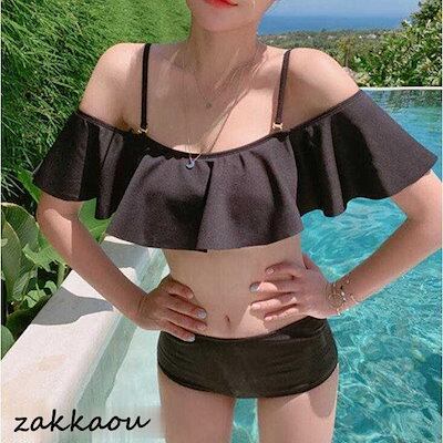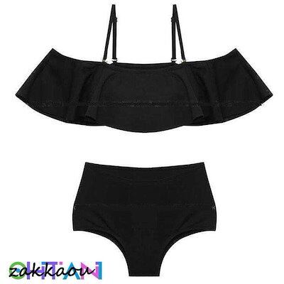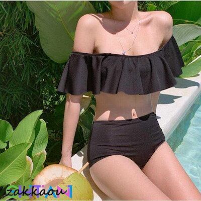 フリル ブラック レディース タンキニ 2点セット カジュアル 韓国風 ハイウエスト ママ 水着 バックレス 温泉 着痩せ 海水浴 リゾート 20代30代40代