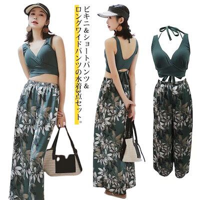 水着 レディース 3点セット ビキニ ショートパンツ ワイドパンツ タンキニ Vネック ママ水着 体型カバー 露出控えめ ロングパンツ お尻 太もも カバーアップ 女性 大人 バスト 盛れる 20代