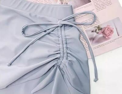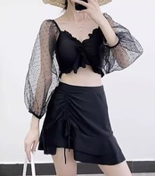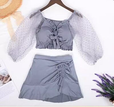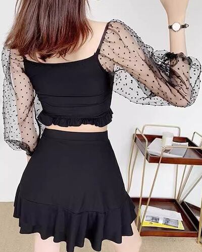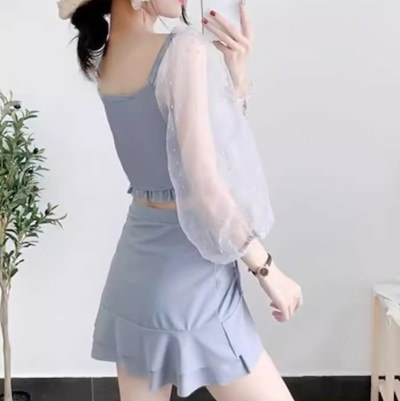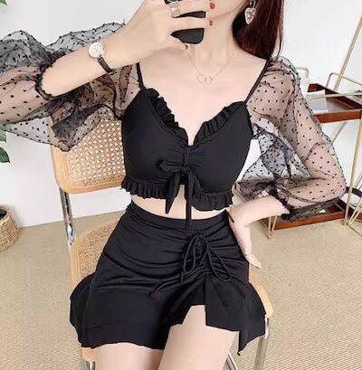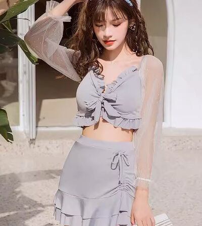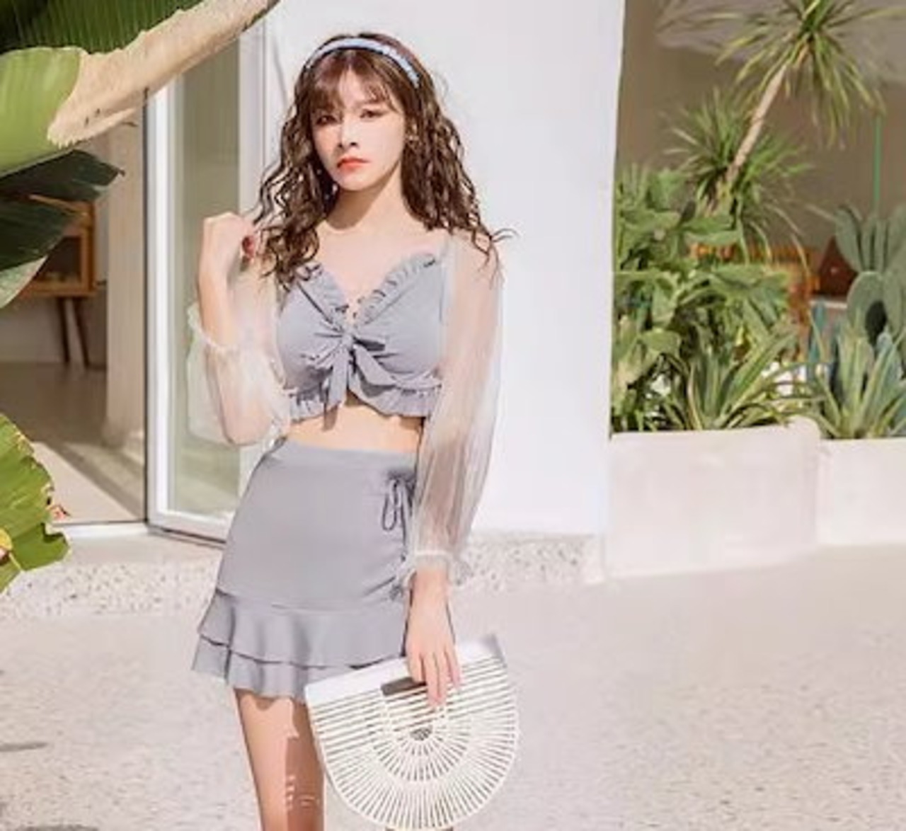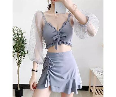 水着 ビキニ レディース タンキニ スカートスタイル セパレート ノンワイヤー パッド付き 二の腕カバー 長袖 Vネック リボン フリル 透け感 プリーツ セット ツーピース 上下セット かわいい