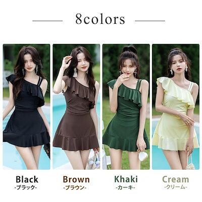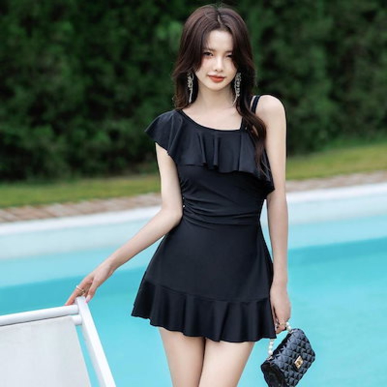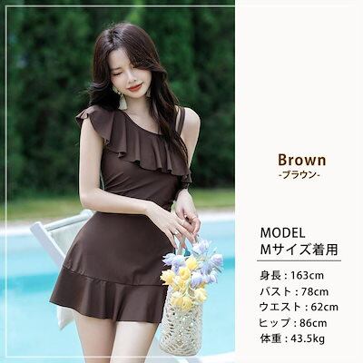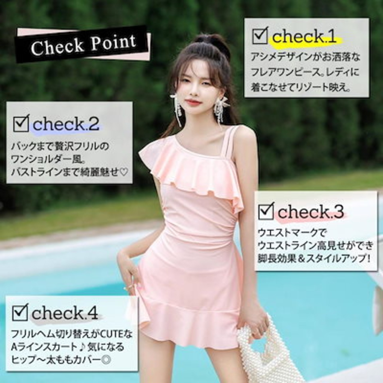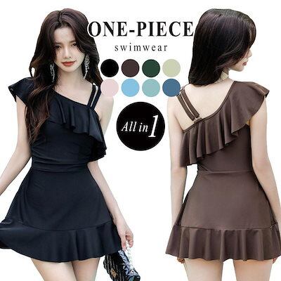 水着 レディース ワンピース オールインワン ワンショルダー おしゃれ かわいい 10代 20代 30代 プチプラ フリル 肩出し アシメ 黒 無地 フェミニン ガーリー ハ