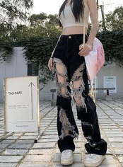 ジーンズ 新作 スパイスガール ブロークン・ホール ジーンズ レディース 大きいサイズ ファット・シスター ハイウエスト 薄手 ワイドパンツ ストレートパンツ ?国ファッション