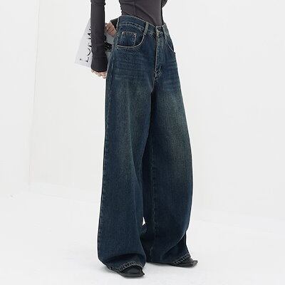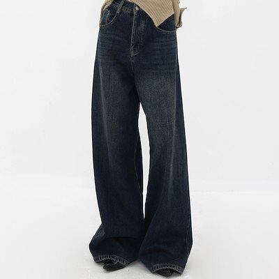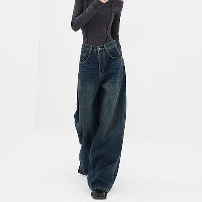 デニムパンツ アメリカンスタイル レトロ ダークカラー ストレート ジーンズ レディース 2024春秋新作 大きいサイズ ルーズ 百掛け ワイドパンツ 韓国