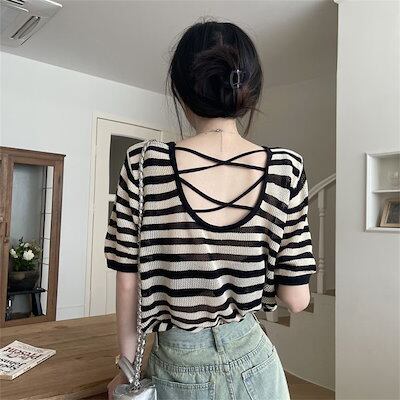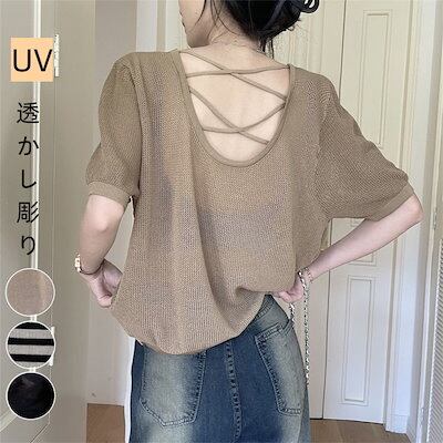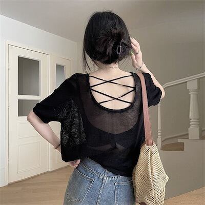 UVカット 透かし彫り ニットtシャツ 半袖 レディース 夏 紫外線対策 ブラウス 韓国ファッション セクシー 美背 半袖 トップス