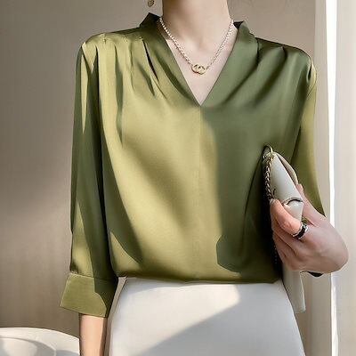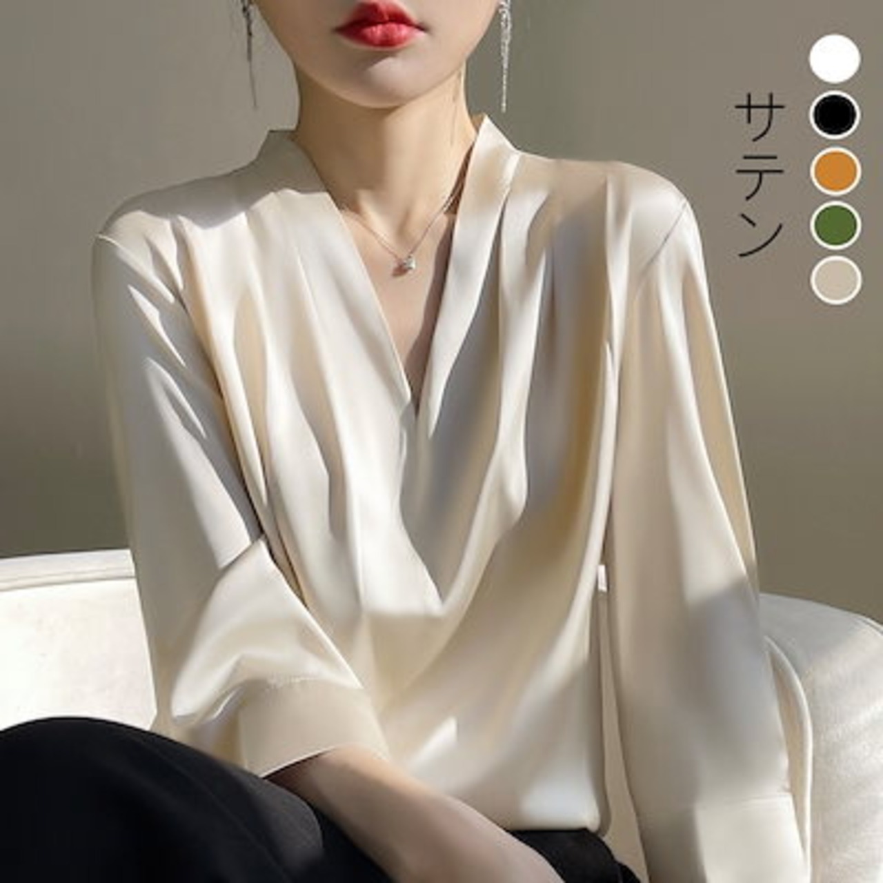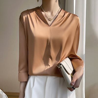 シアーシャツ 秋 シブラウス サテンブラウス レディース 秋服 気質百掛け 長袖トップス 九分袖 Vネック?韓国ファッション シャツ 通勤ワイシャツ母の日