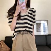 Tシャツカットソー Tシャツ 夏 アイスシルク tシャツ 半袖 レディース ボーダー ニット Tシャツ ゆったり着痩せ 半袖 ワイシャツ