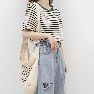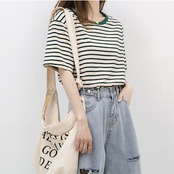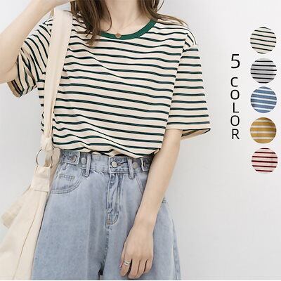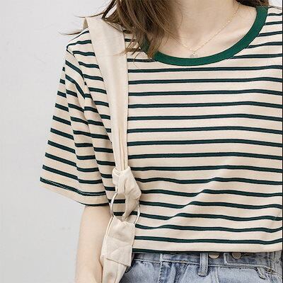 Tシャツカットソー 夏 ストライプ tシャツ レディース 百掛け 半袖 トップス 怠惰な風 カジュアル ゆったり シャツ 韓国ファッション 快適 Tシャツ /ブラウス