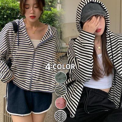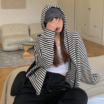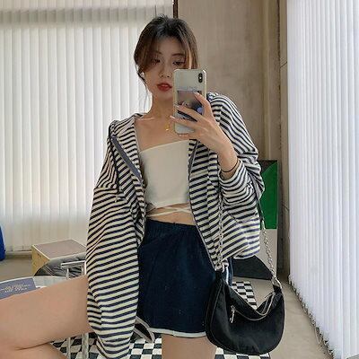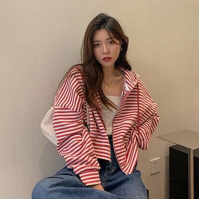 秋 アウター カジュアル百掛け パーカー レディース 韓国ファッション ストライプ 長袖トップス 怠惰な風 薄 ショートアウター 着痩せ UVカット