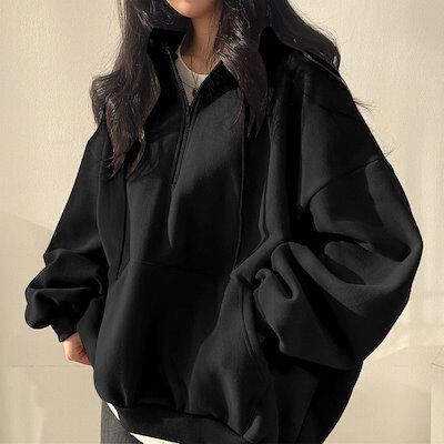 韓国ファッション バーカー ハーフジップ 裏起毛 パーカー レディーストップス スウェット パーカー チャック付き 無地