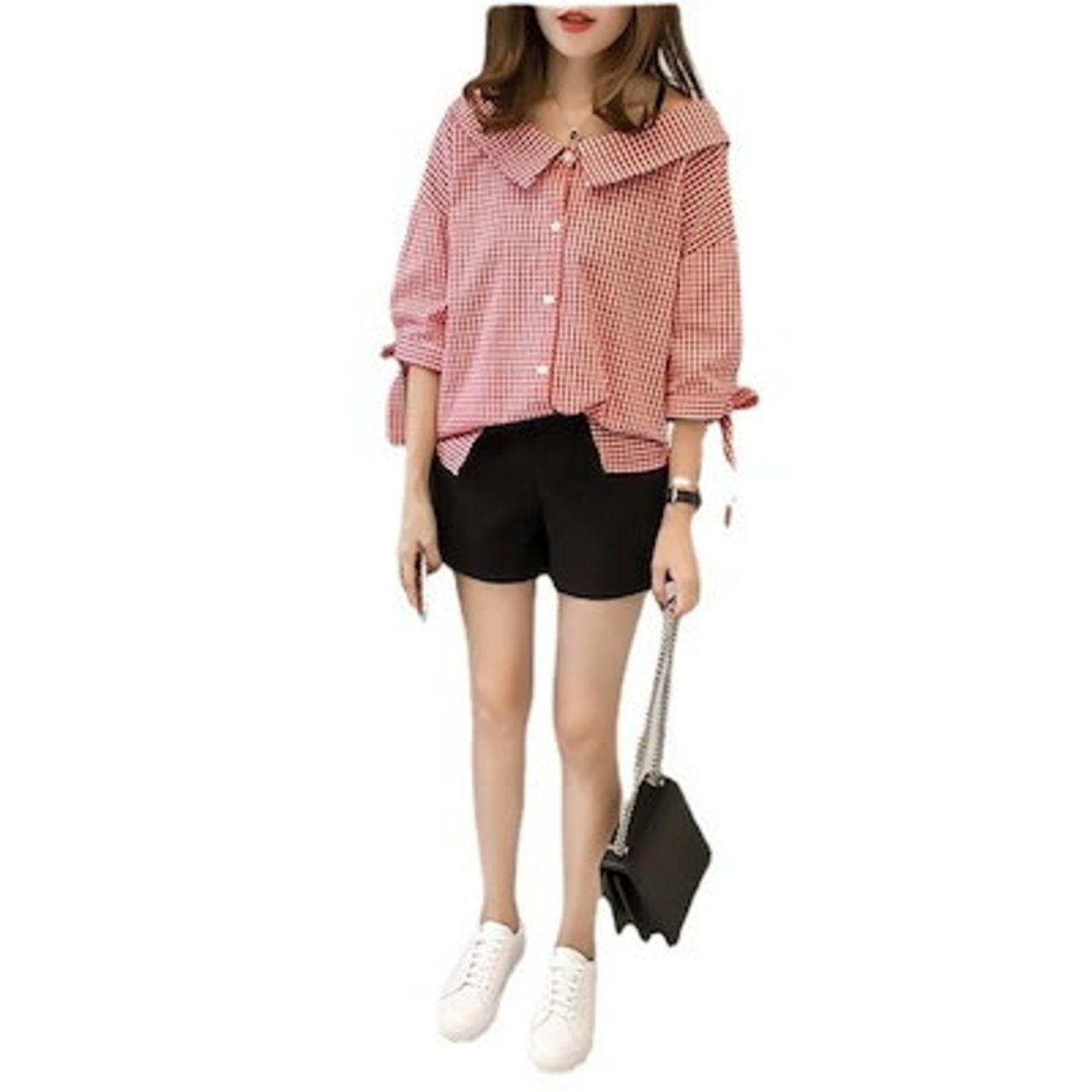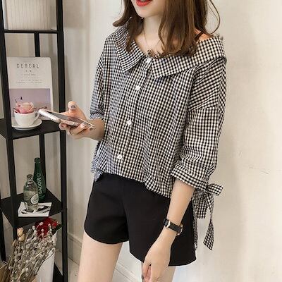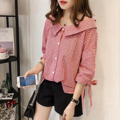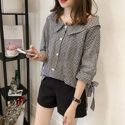 今っぽシアーシャツ 2024 最新版婦人服ドール襟チェックシャツ新作リボン七分袖トップスボトム パーカー レディース 韓国