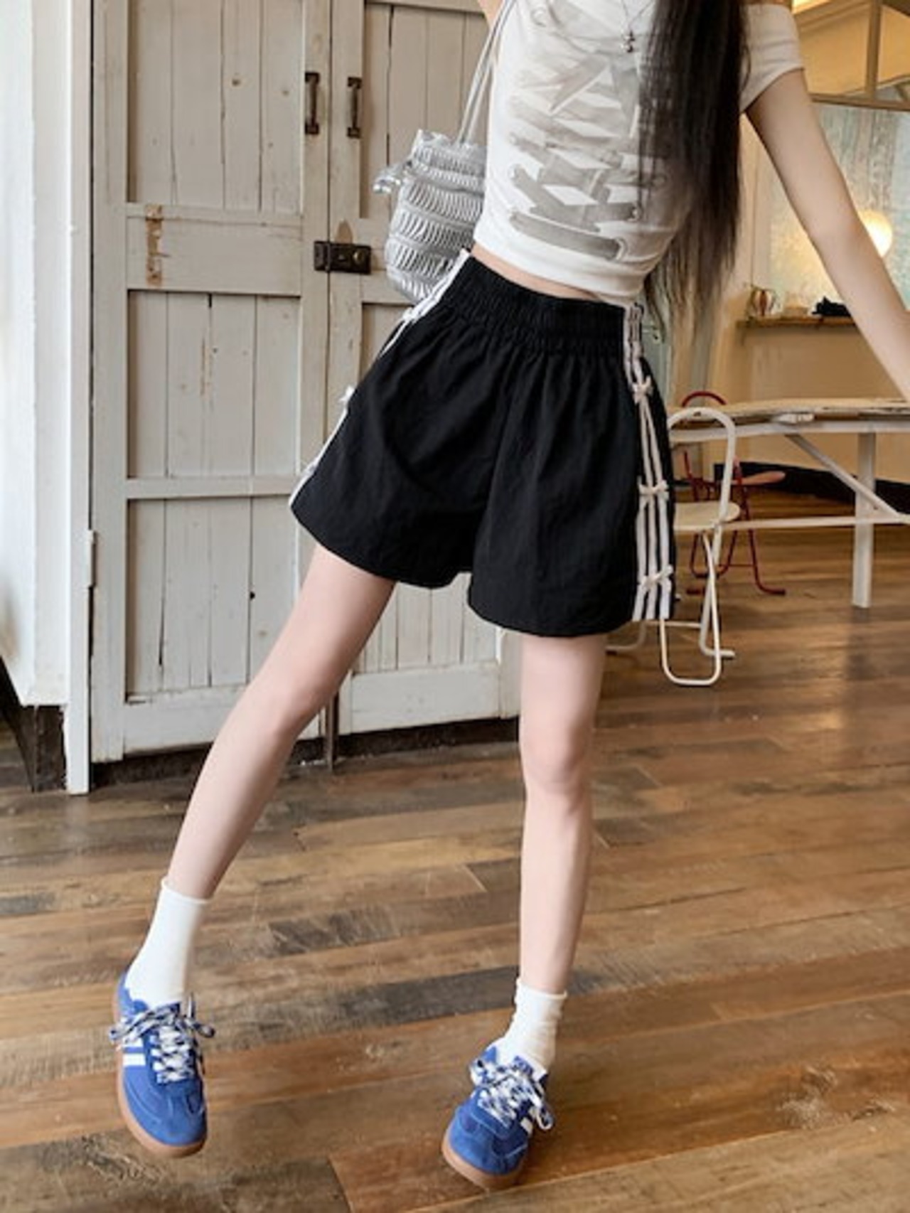 2024 春夏パンツ ショート丈 ワイド ウエストゴム ハイウエスト 美脚効果 脚長効果 細見え 短パン 黒白 おしゃれ かわいい 韓国ファッション系 レディース サイドお出かけ