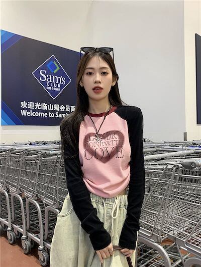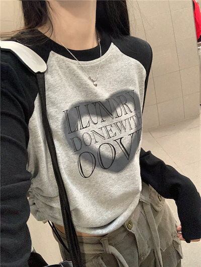 2024春夏 Tシャツ ショート カットソー 長袖 トップス カジュアル 配色 韓国ストリート タイト スリーブ 肌見せ T ファッション かわいいトップス