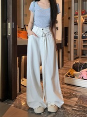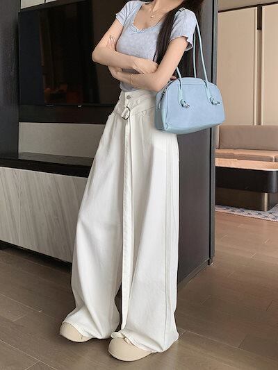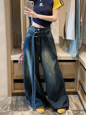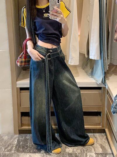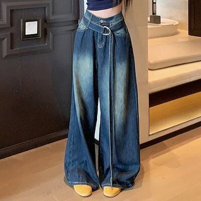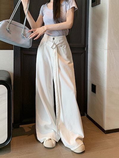2024夏 韓国パンツ デニム ジーンズ ロング丈 ワイドレッグ ウォッシュ加工 ベルト ハイウエスト 美脚効果 脚長効果 細見え 夏 白 青 おしゃれ かわいい 韓国ファッション レディース お出か