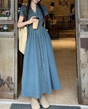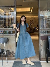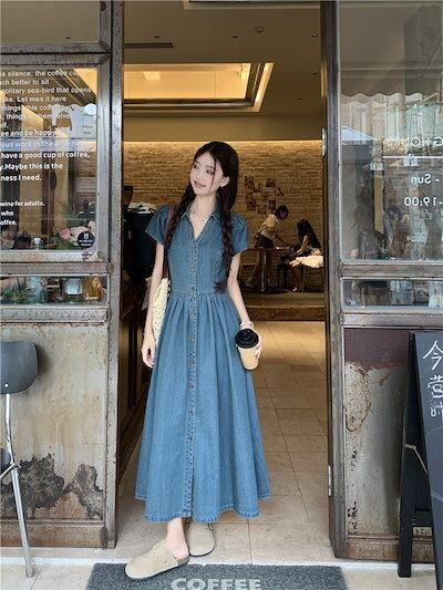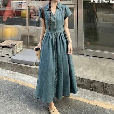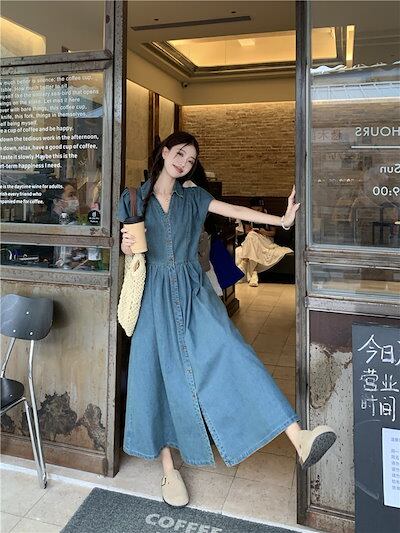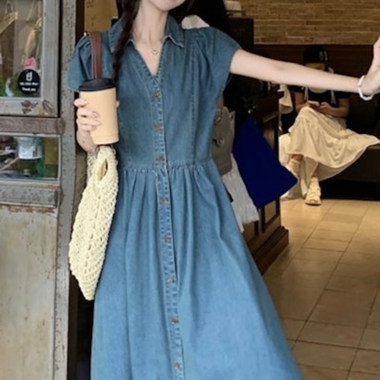 2024夏 韓国ワンピース デニム シャツ ロング丈 半袖 ボタン Aライン 細見え 夏 青 ブルー おしゃれ かわいい キュート 甘め きれいめ 韓国ファッション レディース お出かけ