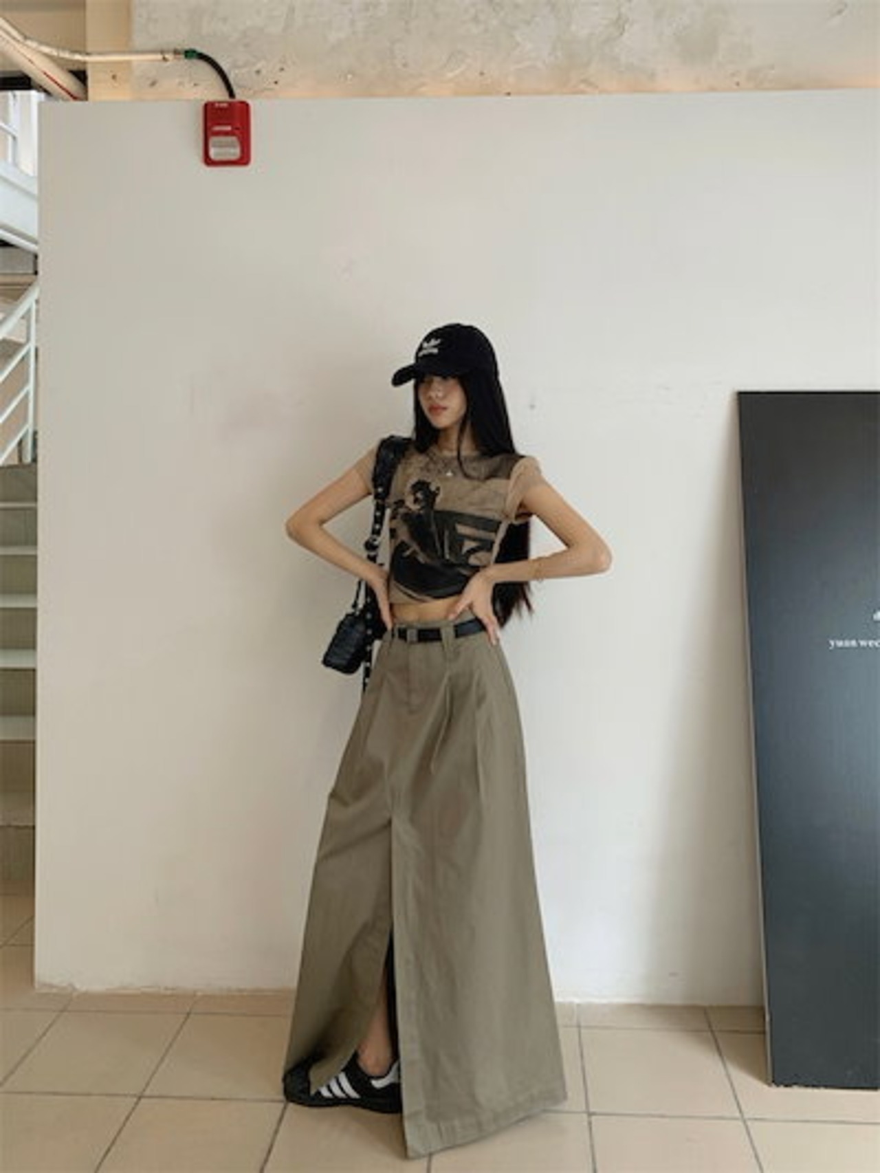 2024 春夏スカート ロング丈 Aライン スリット フロントオープン ハイウエスト 美脚効果 脚長効果 細見え 夏 カーキ おしゃれ かわいい 韓国ファッション レディース お出かけ