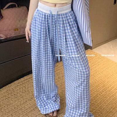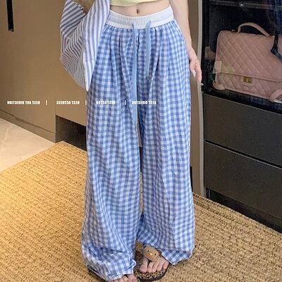 2024 春夏パンツ ロング丈 モップパンツ ギンガムチェック ワイド ストレート ウエストゴム ハイウエスト 美脚効果 脚長効果 細見え 夏 青 韓国ファッション レディース かわいい おしゃれ カ