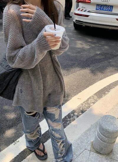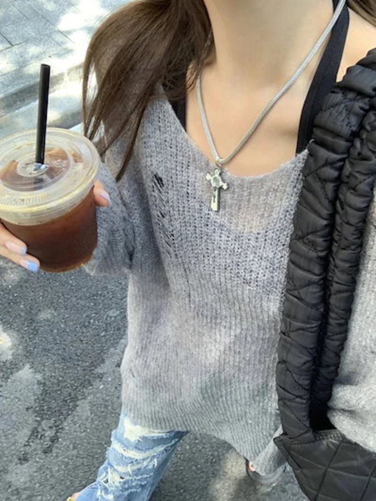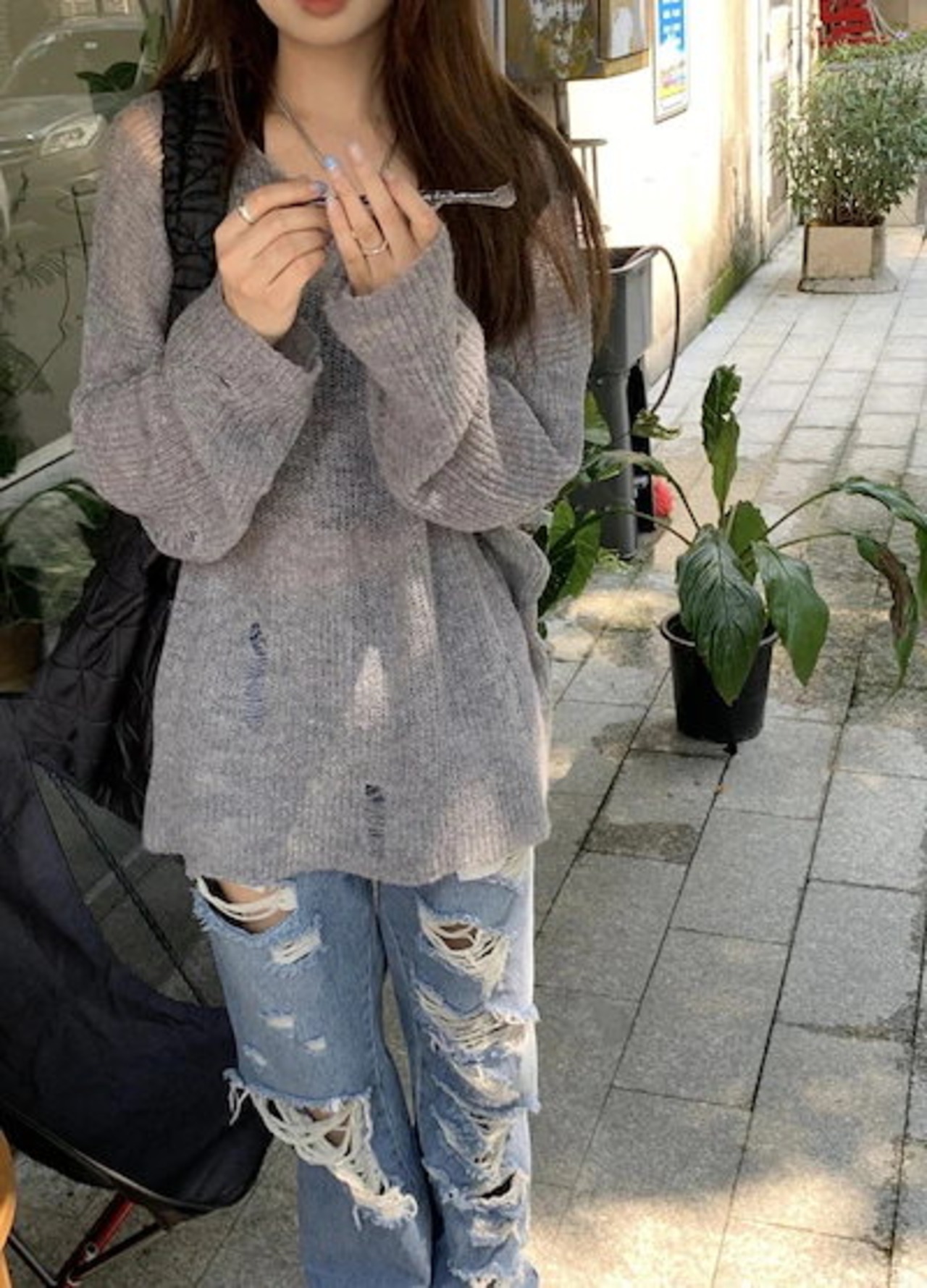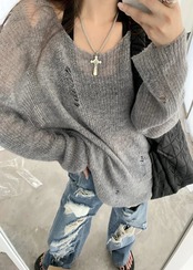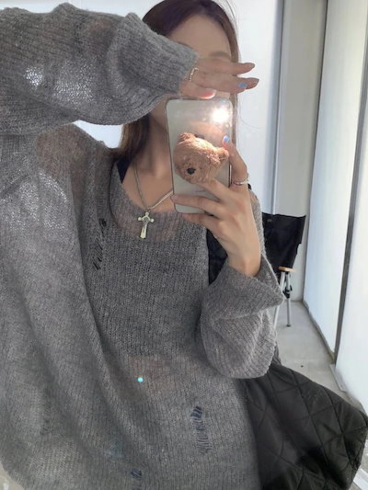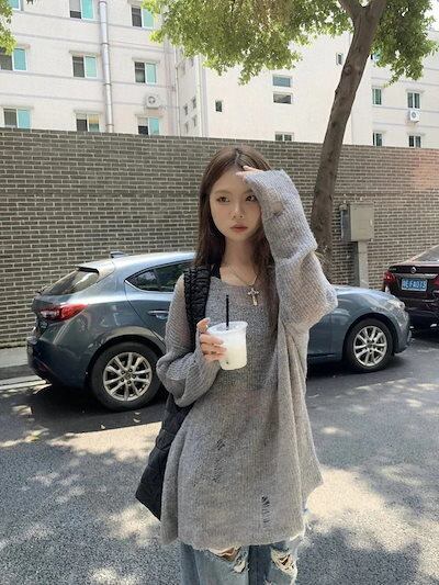 2024春夏 長袖 ニット プルトップスストリートカジュアエコルシルエットクルーネック加工色っぽ 女っぽ カジュアル 大人っぽ 上品 サイズフェミニンゆったりカジュアル レディースゆったり秋冬春