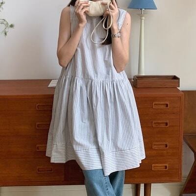 2024 夏 韓国ワンピース ミニ丈 Aライン ストライプ ラウンドネック ノースリーブ ハイウエスト 美脚効果 脚長効果 細見え 夏 おしゃれ かわいい キュート ガーリー 韓国ファッション レディ