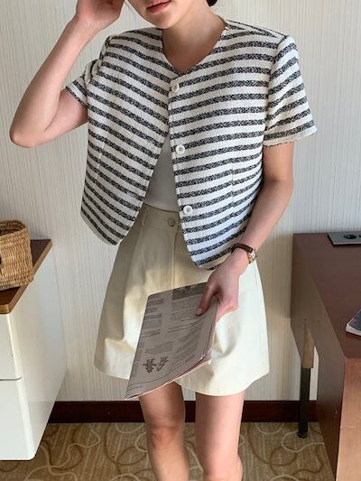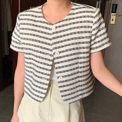 2024秋冬アウター ジャケット ラウンドネック ボーダー 半袖 ボタン 秋 黒 青 水色 ライトブルー おしゃれ かわいい 韓国ファッション レディース お出かけ
