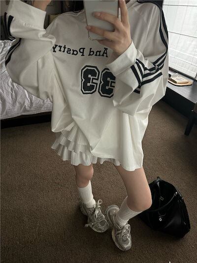 2024秋冬トップス レタープリント ナンバリング 長袖 オーバーサイズ サイドレトロ 韓国系ファッションネック レディース 大人可愛い ガーリー